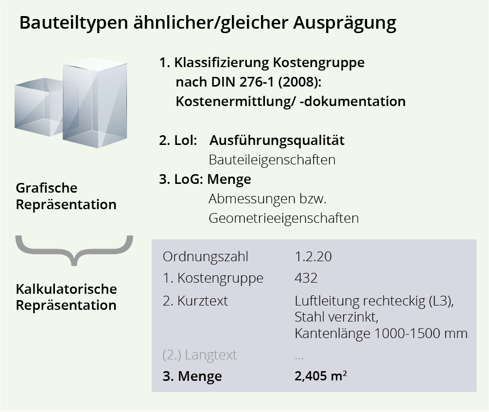Es ist selbsterklärend, dass der Genauigkeitsgrad der Kostenermittlung eng mit der Informationstiefe verknüpft ist, also mit der Information, die über entsprechende Attribute (Bauteileigenschaften) über das Bauteil bekannt sind. Bezogen auf den Planungsprozess ist eine belastbare Kostenprognose erst mit einem ausschreibungsreifen Planungsstand nach der Ausführungsplanung erreichbar, wenn ein gezeichnetes Bauelement sowohl mengen- als auch qualitätsbezogen einer Leistungsposition zugeordnet werden kann (Abb. 3).