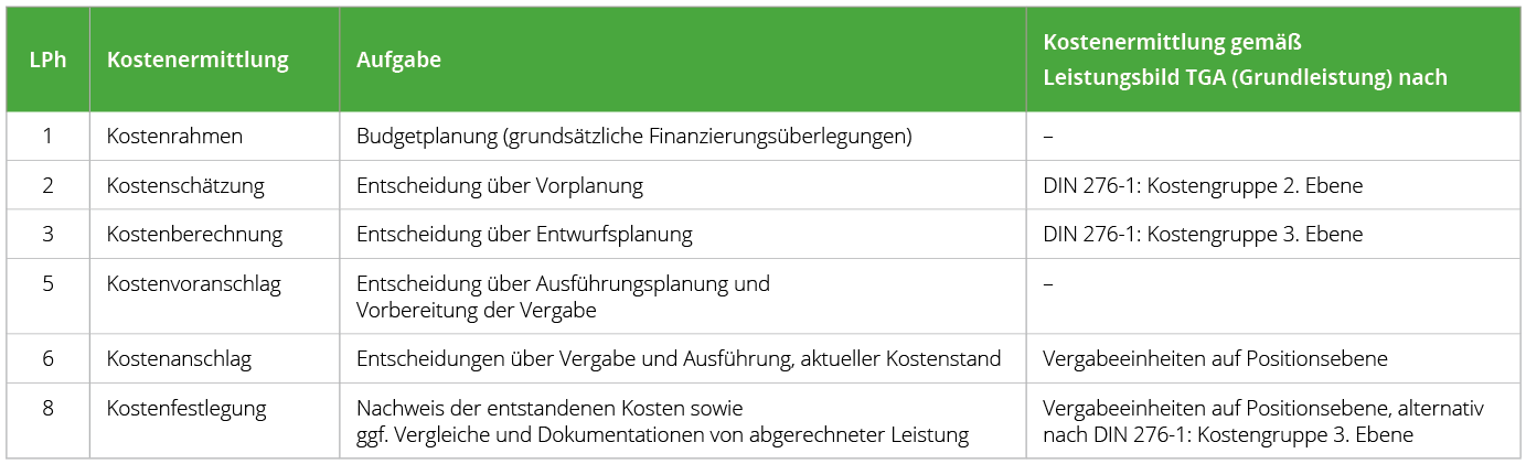 Ein kurzer Blick auf die Normenwelt vorab. Auch nach aktueller HOAI ist die DIN 276-1 „Kosten im Bauwesen; Teil 1: Hochbau“ in der Fassung von 2008 aus bauvertraglicher Sicht die maßgebende Kostenberechnungsgrundlage. An dieser orientiert sich die jüngste VDI 2552 im Teil 3 „Building Information Modeling - Modellbasierte Mengenermittlung zur Kostenplanung, Terminplanung, Vergabe und Abrechnung“ (2018): Als Grundleistung nach HOAI ist für das Leistungsbild der technischen Ausrüstung eine Mitwirkungsverpflichtung bei der Erstellung von Kostenprognosen in den Leistungsphasen 2 und 3 vorgesehen (Kostenschätzung und -berechnung, vgl. Tab. 1).