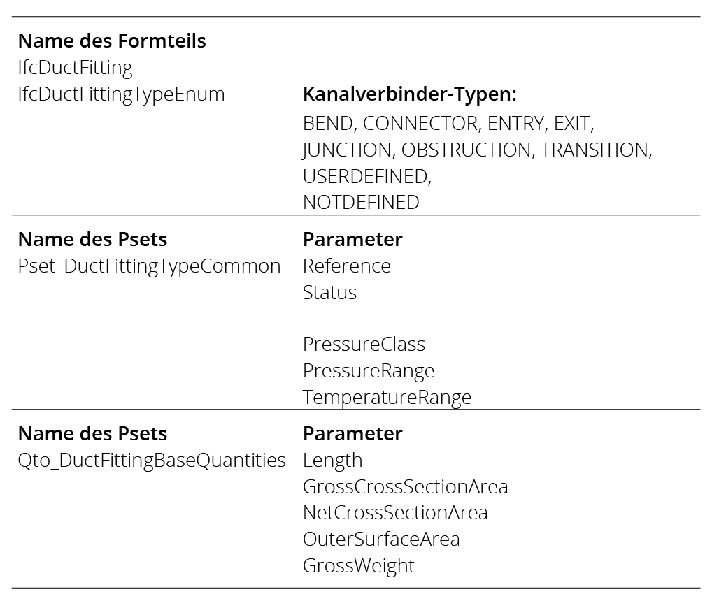 Viele der am Markt verfügbaren AVA-Produkte bieten mittlerweile den IFC-Modellimport zur modellbasierten Mengenermittlung an. Verlässt man sich allerdings auf die IFC-Standardklassen und nimmt keine Änderungen der Exportfunktionalität in der CAD-Autorensoftware vor, ist der Informationsverlust mitunter beachtlich. Zurückzuführen ist dies auf die IFC-Standardklassen und die verknüpften Standardparameter (sog. „Psets“ und „Base Quantities“, vgl. Tab. 3). Die IFC-Klassen für Formteile von Lüftungskanälen und -rohren besitzen die erforderlichen Aufmaßgrößen nach DIN ATV 18379 nicht. Ohne Erweiterung der IFC-spezifischen Exportparameter um die erforderlichen Aufmaßgrößen führt dies zwangsläufig dazu, dass davon abweichende und unter Umständen aufmaßrelevante Parameter eines Bauteils nicht nach IFC überführt werden und damit auch nicht für die AVA-seitige Mengenberechnung zur Verfügung stehen.