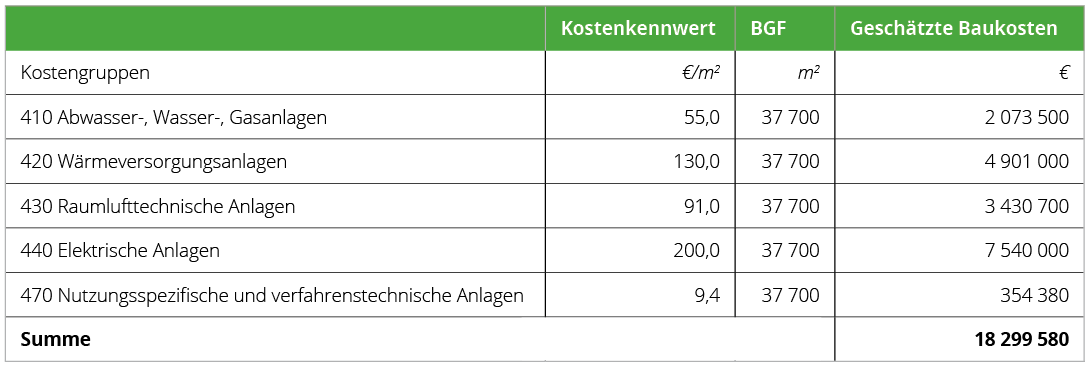 Die Frage nach der Herkunft und Qualität von Kostenkennwerten für die Kostenschätzung und -berechnung stellt die VDI 2552-3 nicht. Allgemein gesprochen sind Kostenprognosen mittels statistischer Kostenkennwerte, wie sie die DIN 276-1 und die VDI 2552-3 auf Basis der Bruttogeschossfläche (BGF) vorschlagen, immer mit mehr oder weniger Unschärfe behaftet. Dies gilt unabhängig davon, ob die Kostenkennwerte nun aus dem eigenen Datenbestand oder externen Bibliotheken (BKI Kostenplaner, DBD BIM, Sirados Baudaten ...) eingepflegt werden. Dieser Umstand betrifft auch die Gebäudeausrüstung, da in frühen Entwurfsstadien die dimensions- und qualitätsbestimmenden Einflussgrößen als maßgebende Kostenfaktoren für ein Anlagenkonzept noch nicht abschließend geklärt sind – marktbedingte Baupreisschwankungen außen vorgelassen. Leicht nachvollziehbar wird diese methodische Unschärfe am Beispiel der Raumflächenkonditionierung, da zwischen lufttechnisch behandelter oder konditionierter zu unkonditionierter BGF innerhalb der Kostengruppen 420 „Wärmeversorgungsanlagen“ und 430 „Raumlufttechnische Anlagen“ nicht unterschieden wird. Es ist einleuchtend, dass der Kostenaufwand für beheizte und belüftete Bruttogeschossflächen im Gegensatz zu unkonditionierten Flächenabschnitten ungleich höher ausfällt. Für das Kostenergebnis sind die Art der Flächennutzung und -konditionierung sicherlich ausschlaggebend. Per se sieht die DIN 276-1:2008 eine Berechnung getrennt nach unterschiedlichen Versorgungsbereichen o. ä. aber nicht vor.