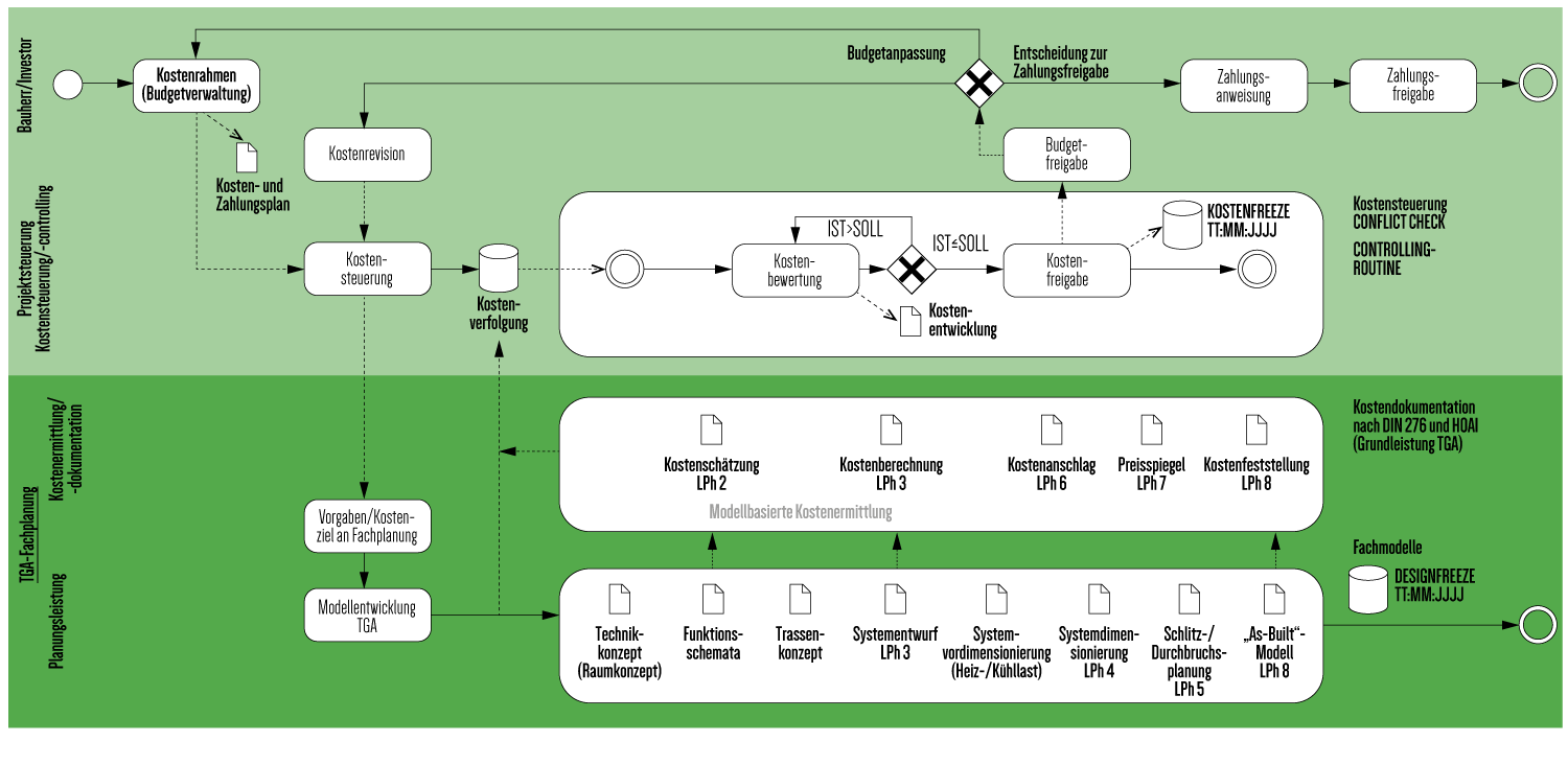 Im Umkehrschluss wird sich der Fachplaner nicht dazu veranlasst sehen, den Detaillierungsgrad für die TGA-relevanten Kostengruppen 400 und 500 zum Zweck einer noch relativ volatilen Kostenprognose in den Entwurfsphasen vorauseilend zu erhöhen, sofern die entsprechende Planungsgrundlage fehlt. Die grundsätzliche Empfehlung in Bezug auf die Informationstiefe muss deshalb lauten, nur so früh, wie es im Planungsprozess auch sinnvoll umsetzbar ist, die Informationstiefe zu erhöhen.