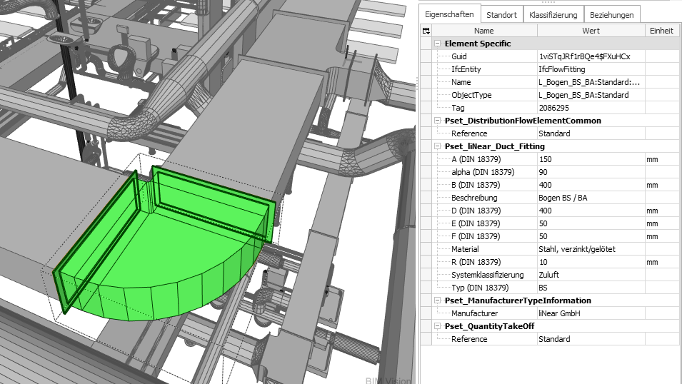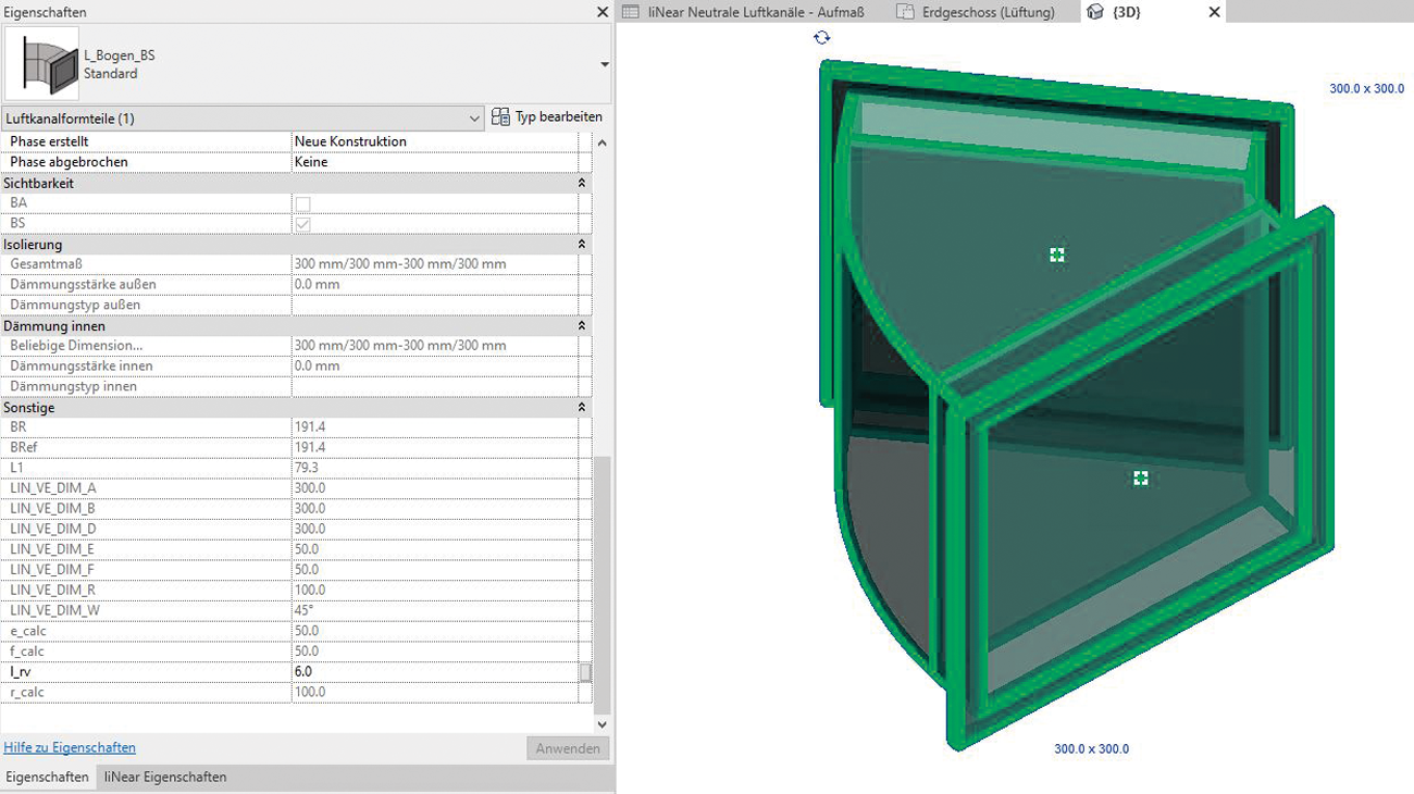 Die Bedingung ist, dass Modellparameter „aufmaßkonform“ erstellt sind und entsprechend eindeutige, d. h. formalisierbare Berechnungsregeln existieren. Die Voraussetzungen dafür schaffen CAD-seitig entsprechend parametrisierte Bauteilbibliotheken und formalisierte Abrechnungsregeln, wie sie den DIN ATVs der VOB/C zugrunde liegen. Seit einiger Zeit sind bereits die neutralen LINEAR-Kanalklassen in Revit mit einer Parametrik versehen, die ein Kanalaufmaß nach DIN 18379 ermöglicht. Dieser Ansatz wird aktuell nachgeschärft, damit ein exakter Export in die Fertigung mithilfe der e-klimaX-Schnittstelle sowie ein modellbasiertes Aufmaß nach DIN 18379 oder ÖNORM H 6015-2 (in Planung) erfolgen kann.