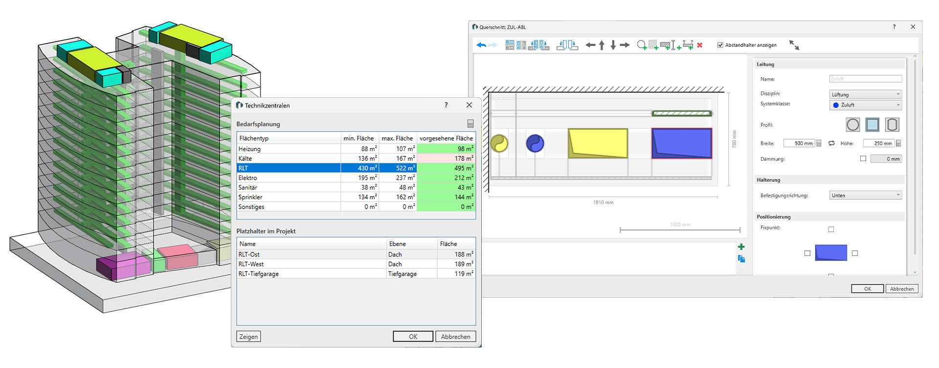 Ein typisches Problem ist der unzureichende Platz im Architekturmodell für Technikzentralen oder Medienführungen. Die Ursache liegt oft in schlecht organisierten Abstimmungsprozessen und dem Fehlen geeigneter digitaler Werkzeuge. Hier setzt das LINEAR Trassenkonzept für Revit an, das einen gewerkübergreifenden Workflow ermöglicht. Basierend auf „Provision for Voids“ lassen sich Technikzentralen und Trassenführungen mit minimalem Aufwand konzeptionieren. Es genügt, die Bruttogrundfläche des Gebäudes und das grobe Nutzungskonzept (z.B. Verwaltung, Einzelhandel, Großküche) zu definieren, um Raumbedarfe zu ermitteln. Ergänzt wird dies durch Funktionen zur Dimensionierung von Trassen und deren Querschnitten. Das Ergebnis ist ein dreidimensionales Trassenmodell, das Raumkonflikte minimiert und als Grundlage für die automatisierte Medienführung dient. Anstatt also auf die vom Architekturbüro vorgegebenen Platzbedingungen zu reagieren, kann in der TGA-Planung bereits zu Beginn des Prozesses modellbasiert der Platzbedarf übermittelt werden. Diese frühzeitige Einflussnahme erspart dann langwierige Diskussionen und aufwendige Umplanung in den folgenden Leistungsphasen.