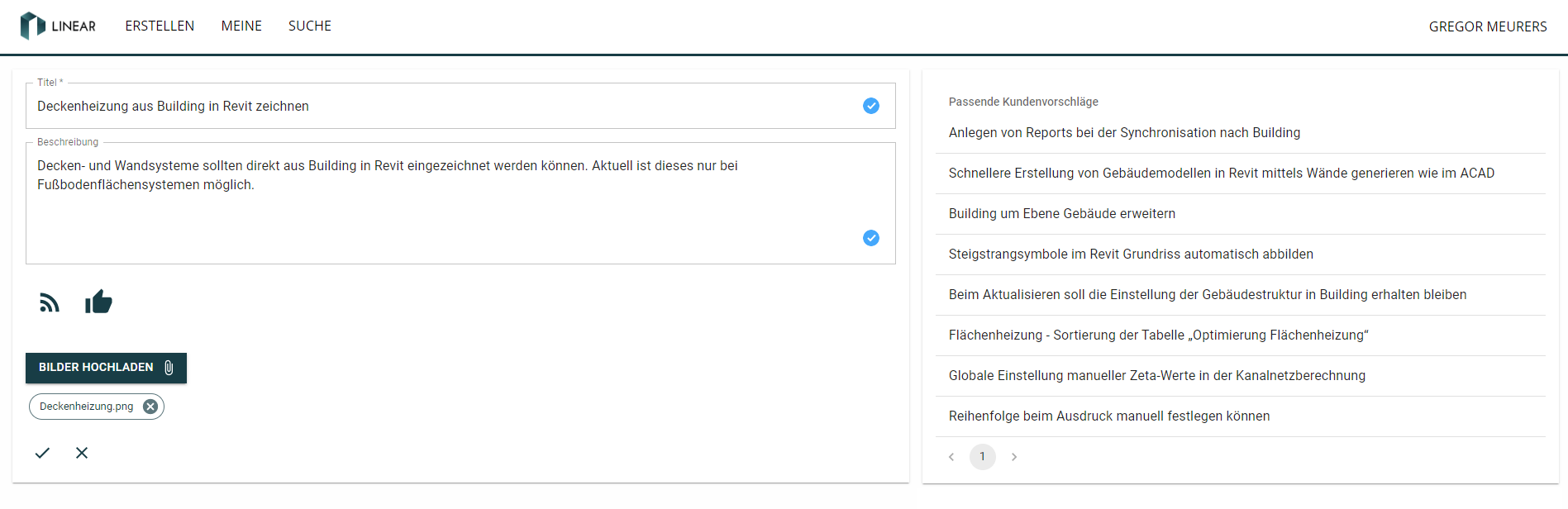 Im ersten Schritt können Sie einen Vorschlag einbringen, indem Sie Ihre Anregungen in kompakter Form formulieren und gegebenenfalls durch Screenshots ergänzen. Während der Erstellung werden Ihnen möglicherweise bereits vorhandene, ähnliche Vorschläge angezeigt. In diesem Fall können Sie zum jeweiligen Vorschlag wechseln und für diesen abstimmen, um für ihn eine aussagekräftige Anzahl von Stimmen zu erhalten.