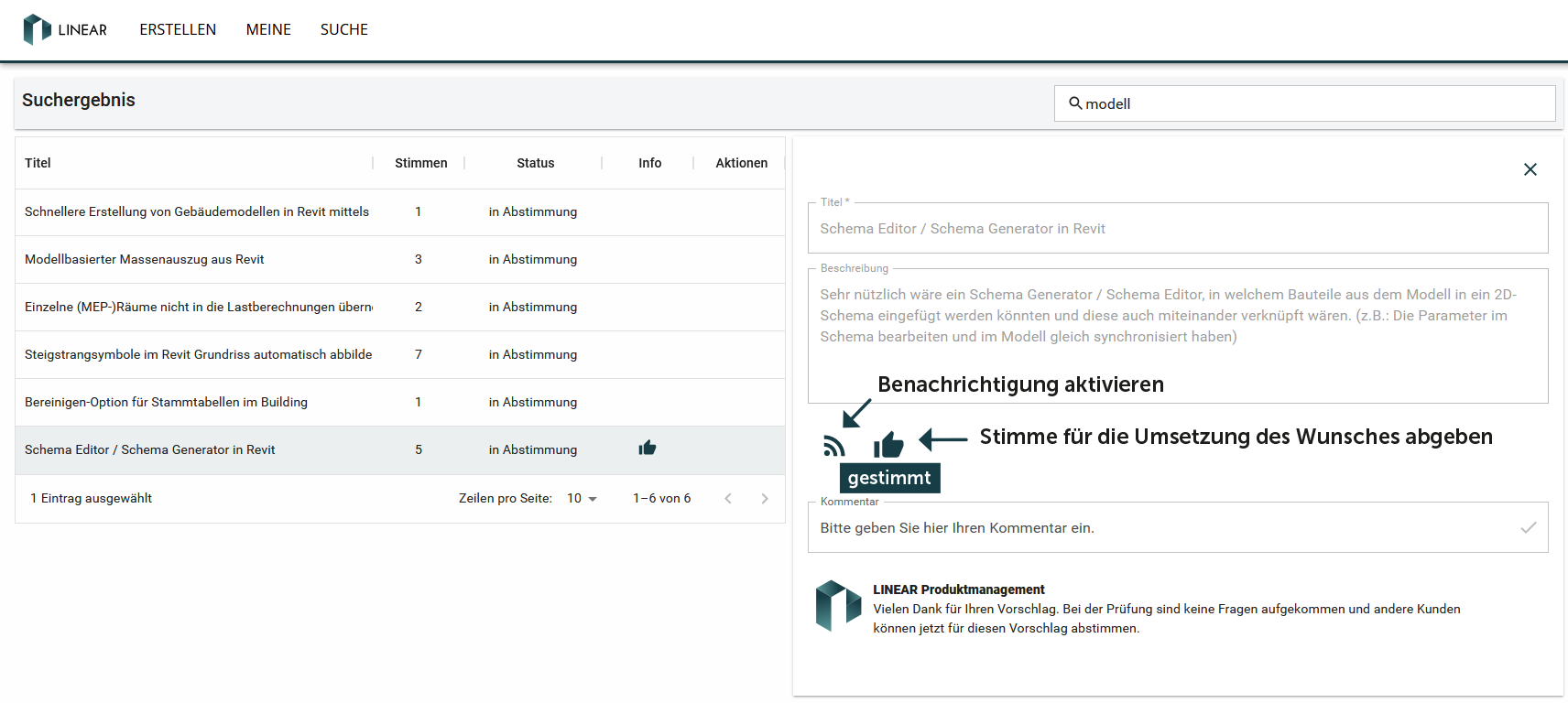 In der Abstimmungsphase (Schritt 3) kann über Vorschläge abgestimmt werden. Dafür haben Sie die Möglichkeit, im Idea Channel nach Ideen zu suchen und Ihre Stimme mit einem „Daumen hoch“ für den gewünschten Vorschlag abzugeben. Sie können außerdem Benachrichtigungen aktivieren, um per E-Mail über Aktivitäten und Statusänderungen der Anregungen informiert zu werden. Abhängig von der Anzahl der Stimmen und der Bewertung des Produktmanagements werden die Vorschläge schließlich an die Entwicklung weitergeleitet.