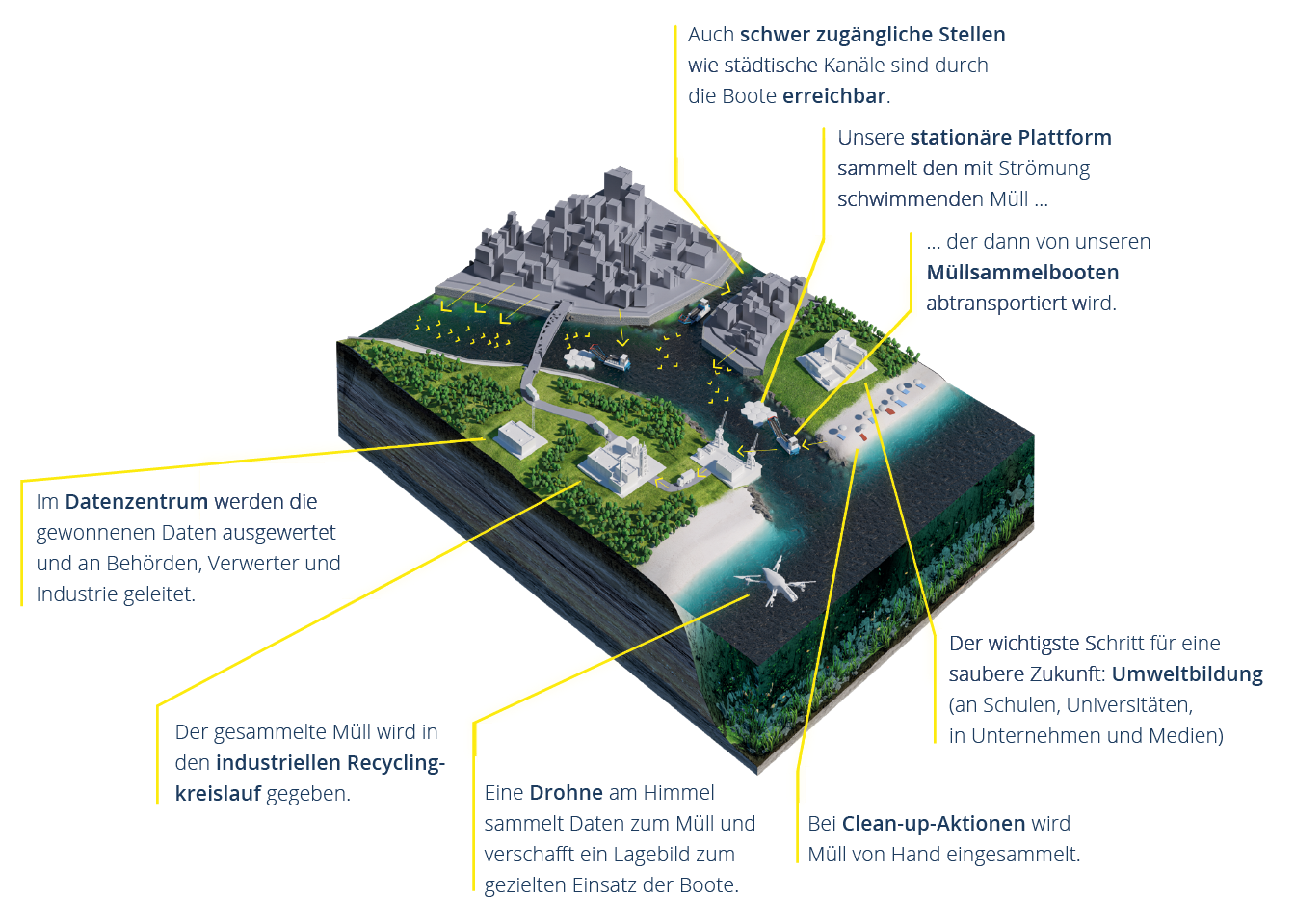 Die zwei Säulen von everwave sind daher technologische Innovation und ökologische Inspiration. Unter Innovation fasst everwave drei grundlegende Begriffe zusammen: Detect, collect, recycle. Dafür setzt das Start-up eigens entwickelte Technologien ein, das CollectiX-Müllsammelboot und die HiveX-Plattform. Ersteres ist bereits europaweit im Einsatz und wird von Drohnen mit künstlicher Intelligenz ergänzt, die den Müll nicht nur aufspüren, sondern auch analysieren und somit Rückschlüsse auf die Zusammensetzung und Herkunft des Mülls zulassen. Außerdem lässt sich das gesammelte Plastik so mit lokalen Recyclingpartnern effektiver verwerten. Die Plattform HiveX ist zum Patent angemeldet und wird im Frühjahr 2022 zum ersten Mal eingesetzt. Boote und Plattformen sollen sich einmal ergänzen. Während HiveX stationär auf breiten Flüssen liegt, in langen Kanälen die Strömung des Flusses beruhigt und so Plastik auffängt, fährt das CollectiX-Boot an all jene Stellen, an die die Plattform nicht heranreicht. Doch bis die beiden Technologien im Double auftreten, ist das CollectiX auch schon allein im Einsatz.