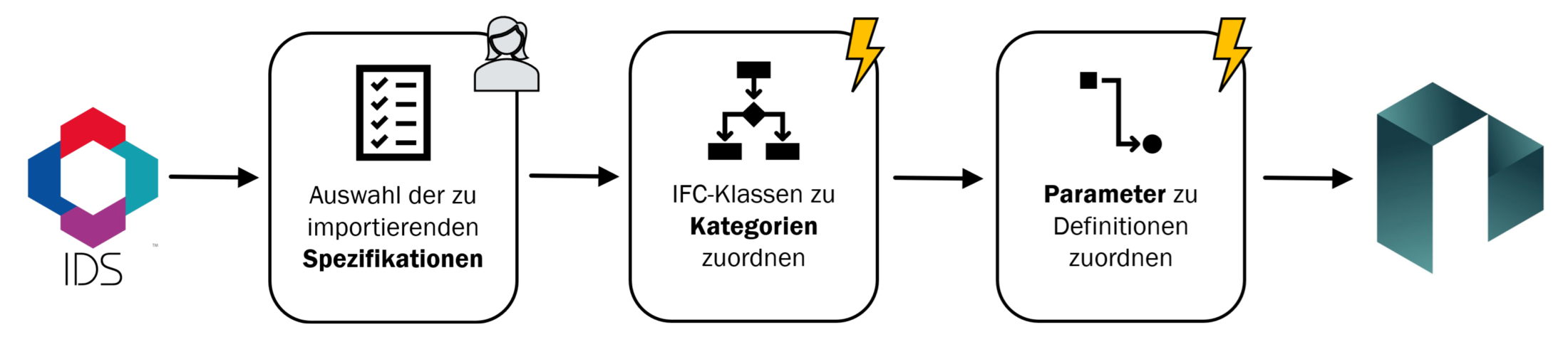 Warum nur teilautomatisiert? Die Antwort bleibt dieselbe wie zuvor. Die beiden Modelle verstehen sich gegenseitig nicht uneingeschränkt, es gibt keine eindeutige Abbildung der IDS auf das Revit-Datenmodell. Wir müssen also die Informationen der IDS schrittweise so anreichern, dass eine Überführung in Revit-Modelle mit möglichst wenig Verlust an strukturellem Wissen geschehen kann (s. Abb. 2).