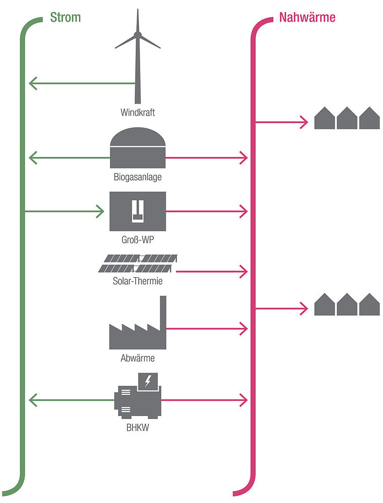 Für die Einzelgebäudeversorgung werden künftig Wärmepumpen das dominierende Heizsystem sein. Bei verdichteter Bebauung bieten Verbundlösungen mittels Wärmenetz vielfach Vorteile. EE-Quellen wie z.B. Flusswärme oder unvermeidbare Abwärme aus Gewerbe und Industrie sowie Solarthermie können wirtschaftlich erschlossen werden. Als Wärmeerzeuger kommen hier künftig vor allem Großwärmepumpen zum Einsatz (Grafik 1). Darüber hinaus bietet die Nutzung von (fester) Biomasse regional Potenzial.