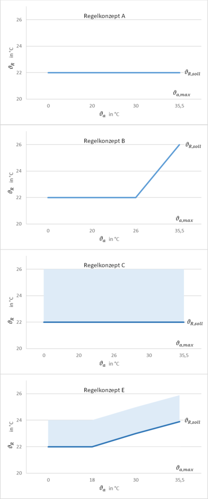 In der VDI 2078 werden verschiedene Regelkonzepte für den Betrieb der Kühlanlage beschrieben. Es gibt Regelkonzepte mit konstanten oder außentemperaturgeführten Raumtemperaturen, des Weiteren gibt es Regelkonzepte mit einem Temperaturband, bei dem eine 2-Punkt- oder Proportional-Regelung genutzt werden kann. Wie groß der Einfluss der Regelkonzepte auf die erforderliche Kühlleistung und den Kühlenergiebedarf ist, wird nachfolgend anhand von vier Regelkonzepten veranschaulicht. Zu diesem Zweck werden die Höchstwerte aus Kühllastberechnung und Jahressimulation für den Eck-Raum beim „24h Betrieb“ berechnet. In Abb. 4 sind die Solltemperaturen der Regelkonzepte dargestellt. Das Regelkonzept A regelt den Raum auf eine konstante Raumtemperatur von 22 °C. Bei diesem Regelkonzept wird der Raum gekühlt, sobald die Raumtemperatur ohne Kühlung ansteigen würde, also wenn mehr Energie dem Raum zugeführt wird, als dieser abführen kann. Damit die Raumtemperatur immer konstant gehalten wird, wird der Raum auch direkt geheizt, wenn weniger Energie dem Raum zugeführt wird, als dieser über die Außenflächen abgibt. Beim Regelkonzept B wird ebenfalls eine konstante Raumtemperatur verwendet. Die Raumtemperatur ist dabei an die Außentemperatur geknüpft. Bis zu einer Außentemperatur von 26 °C wird wie im Regelkonzept B eine Raumtemperatur von 22 °C angewendet. Bei höheren Außentemperaturen wird die Raumtemperatur linear bis auf 26 °C angehoben. Die Regelkonzepte C und E sind 2-Punkt-Regelungen. Bei der 2-Punkt-Regelung wird ein Temperaturband definiert, in dem die Raumtemperatur schwanken darf. Das Temperaturband wird durch eine minimale und maximale Raumtemperatur beschrieben. Die Kühlung setzt ein, wenn die Raumtemperatur über die Maximaltemperatur steigen würde. Im Regelkonzept C ist die minimale Raumtemperatur bei 22 °C festgelegt und besitzt ein Temperaturband von 4 K, sodass der Raum ab einer Raumtemperatur von 26 °C gekühlt wird. Die minimale Raumtemperatur im Regelkonzept E ist wie beim Regelkonzept B an die Außentemperatur geknüpft. Anders als im Regelkonzept B steigt die Raumtemperatur im Regelkonzept E schon bei einer Außentemperatur von 18 °C an. Da die maximale Raumtemperatur ebenfalls bei 26 °C liegt, ist die Steigung der Raumtemperatur im Regelkonzept E geringer als im Regelkonzept B. Die Ergebnisse der Berechnungen der maximalen Kühlleistung sind in Abb. 5 und die des Jahreskühlenergiebedarfs in Abb. 6 dargestellt.