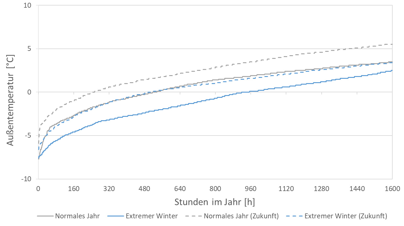 Bei der Betrachtung der niedrigsten Temperaturen im Jahr sind die Temperaturen des aktuellen normalen Jahres und des zukünftigen extremen Winters nahezu gleich (siehe Abb. 11), wodurch sich auch hier die vergleichbaren Ergebnisse der Heizlast und des Energiebedarfs fürs Heizen erklären. Sowohl bei den Zukunftsprognosen als auch bei den aktuellen TRJ liegen die niedrigsten Temperaturen in derselben Größenordnung bei ca. -7 °C. Die Anzahl der Stunden mit negativen Außentemperaturen beim zukünftigen normalen Jahr liegen nur noch bei rund einem Viertel gegenüber dem aktuellen extremen Winter mit ca. 960 Stunden. Aus der vergleichbaren tiefsten Außentemperatur bei den großen Unterschieden in der Anzahl der negativeren Außentemperaturen lässt sich erklären, dass die Unterschiede zwischen der maximalen Heizlast zwischen den TRJ geringer sind als beim Jahresernergiebedarf zum Heizen.