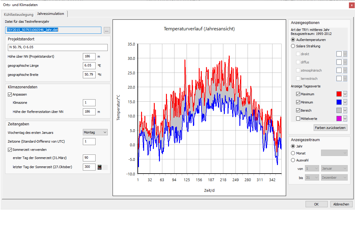 Die für die Berechnung der Jahressimulation genutzten Testreferenzjahre (TRJ) basieren auf Wetterdaten, aus dem für jede Stunde des Jahres ein repräsentativer Wert ausgewählt wurde. Der Deutsche Wetterdienst stellt die TRJ für ganz Deutschland mit einer Auflösung von einem Quadratkilometer kostenlos zur Verfügung. Für jeden dieser Standorte sind sechs verschiedene Datensätze enthalten. Zum einen werden zwei Bezugszeiträume mitgeliefert. Die TRY-2015 beziehen sich auf Wetterdaten von 1995 bis 2012 und bilden die Gegenwart ab. Die zweite Bezugsperiode TRJ-2045 ist als Zukunftsprognose zu verstehen. Diese wird auf Basis von Wettermodellen ermittelt und repräsentiert den Zeitraum 2031 bis 2060. Für beide Bezugszeiträume werden TRJ für ein „Normales Jahr“, einen „Extremen Sommer“ und einen „Extremen Winter“ zur Verfügung gestellt. Das Normale Jahr der TRJ-2015 entspricht einem Mittel aller Jahre der ausgewählten Periode. Bei den Extremen-TRJ wird ein Jahr aus der Periode mit dem entsprechend wärmsten oder kältesten Halbjahr (Sommer: Apr.-Sep.; Winter: Okt.-Mär.) ausgewählt. Somit entsprechen die aktuellen extremen TRJ einem ausgewählten real zusammenhängenden Jahr und das normale Jahr wird aus einer Mittelwertbildung erstellt.