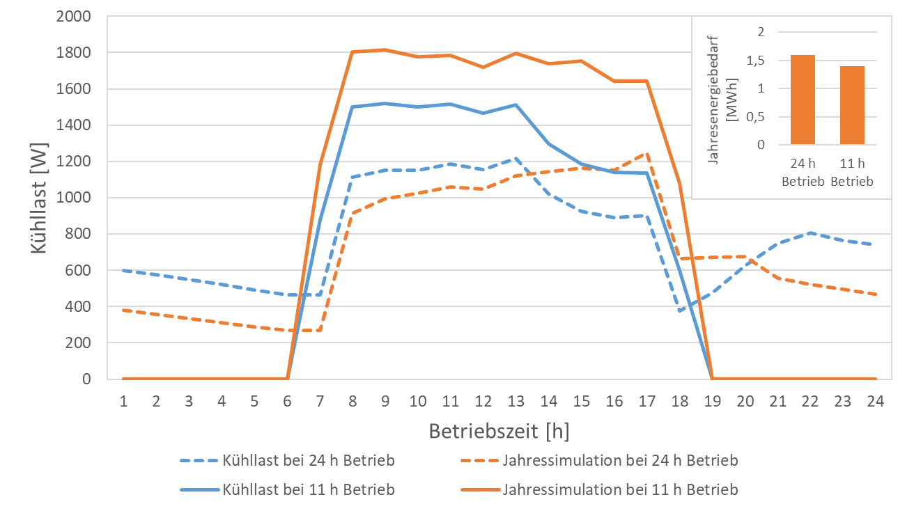 Die Betrachtungen der Betriebsweise, der Regelkonzepte und der unterschiedlichen Testreferenzjahre zeigen die Unterschiede in den Ergebnissen und deren Ursachen zwischen einer Kühllastberechnung und einer Jahressimulation auf. Die definierte Hitzeperiode der Kühllastberechnung endet mit dem Auslegungstag und bei der Jahressimulation wird ein ganzes Jahr berechnet. Schon aufgrund der unterschiedlichen Wetterdaten in den betrachteten Zeiträumen ergeben sich unterschiedliche Ergebnisse. Die Vergleiche der berechneten Kühllast und der höchsten Kühlleistung in der Jahressimulation zeigen, dass sich bei der Jahressimulation in dem Beispiel durchgängig leicht höhere Leistungen ergeben. Die Unterschiede sind aber gering und liegen außer beim „11h Betrieb“ der Kälteanlage bei allen Betrachtungen unterhalb von 6 %. Ein viel größerer Einfluss hatte die Wahl von verschiedenen Anlagenbetriebsweisen, wie z. B. die Einstellungen für das Regelkonzept.