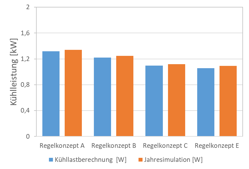 Wie schon bei den Betriebszeiten gezeigt, liegt auch bei den Regelkonzepten die maximale Kühlleistung in der Jahressimulation etwas höher als bei der Kühllastberechnung. Der Vergleich der Regelkonzepte zeigt, dass die höchste Kühlleistung beim Regelkonzept A benötigt wird. Diese reduziert sich bei Regelkonzept B und C und erreicht die niedrigste Kühllast bei Regelkonzept E. Den niedrigsten Jahresenergiebedarf fürs Kühlen benötigt hingegen das Regelkonzept C. Die Unterschiede aus den Regelkonzepten begründen sich durch die unterschiedliche maximal zugelassene Raumtemperatur und die Unterschiede in den Lastgängen.