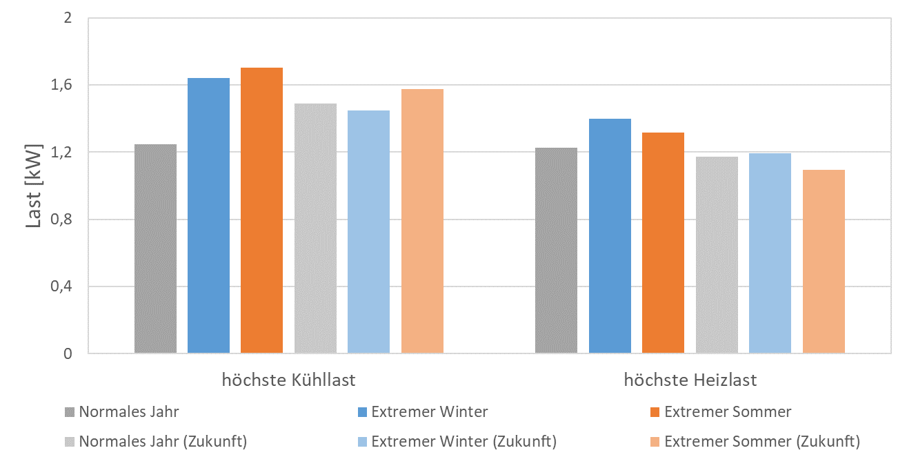 In Abb. 8 und Abb. 9 sind die Lasten und Jahresenergiebedarfe für Heizen und Kühlen der sechs TRJ-Daten dargestellt. Anders als man im ersten Moment erwartet, ergibt sich die höchste Kühllast im aktuellen extremen Sommer und nicht im extremen Sommer der Zukunftsprognose, auch die Kühllast des extremen Winters liegt über der Kühllast des normalen Jahres. Die Betrachtung des Jahresenergiebedarfs zum Kühlen entspricht wieder den Erwartungen, dass der extreme Sommer die meiste Energie zum Kühlen benötigt. Beim normalen Jahr steigen sowohl die Kühllast als auch der Energiebedarf fürs Kühlen von den aktuellen Werten zu der Zukunftsprognose. Die Ergebnisse fürs Heizen entsprechen ebenfalls den Erwartungen, dass die Heizlasten und der Energiebedarf in den Zukunftsprognosen geringer ist als bei den aktuellen TRJ. Des Weiteren fällt auf, dass das aktuelle normale Jahr vergleichbare Ergebnisse liefert wie der zukünftige extreme Winter.