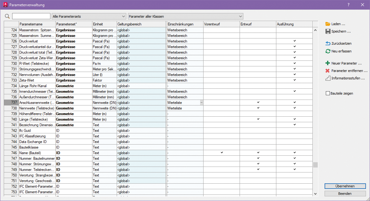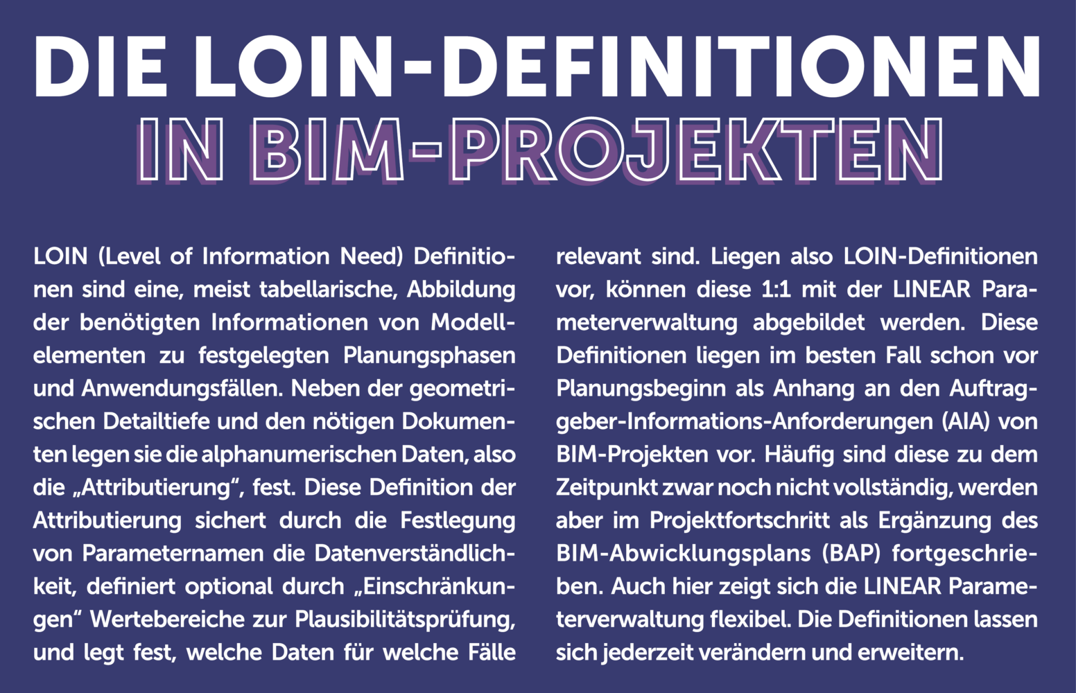 An diesen neuralgischen Punkten (der Datenkorrektheit, der Datenverständlichkeit und der Optimierung der Datenmenge) setzt die Parameterverwaltung an, die mit der LINEAR Version 24.1 zur Verfügung gestellt wird. Die Verständlichkeit der Daten verbessert sie zum einen durch die Möglichkeit, Parametern andere Namen geben zu können, so dass sie bestimmten Vereinbarungen oder Standards entsprechen. Zum anderen wird die (Um-)Gruppierung der Parameter zugelassen. Das wirkt sich sowohl im IFC-Export bei der Erzeugung der Eigenschaftssätze (Propertysets) aus, als auch direkt in den LINEAR Eigenschaften. Die Eingrenzung der Datenmenge erfolgt, indem man verschiedene Fälle – mit oder ohne Leistungsphasenbezug – für die Daten festlegt. Zum Beispiel „Entwurfsplanung“, „Ausführungsplanung/Fachkoordination“ oder einfach nur „wichtige Berechnungsparameter“. Anschließend bestimmt man, welcher Parameter in welchem Fall genutzt werden soll. Die Datenkorrektheit kann wesentlich verbessert werden, indem man für einzelne Parameter Einschränkungen (Wertebereiche, -muster oder -listen) bestimmt, in denen sich die Werte befinden müssen, um „korrekt“ oder zumindest plausibel zu sein.