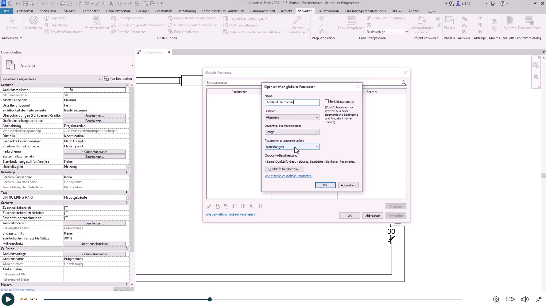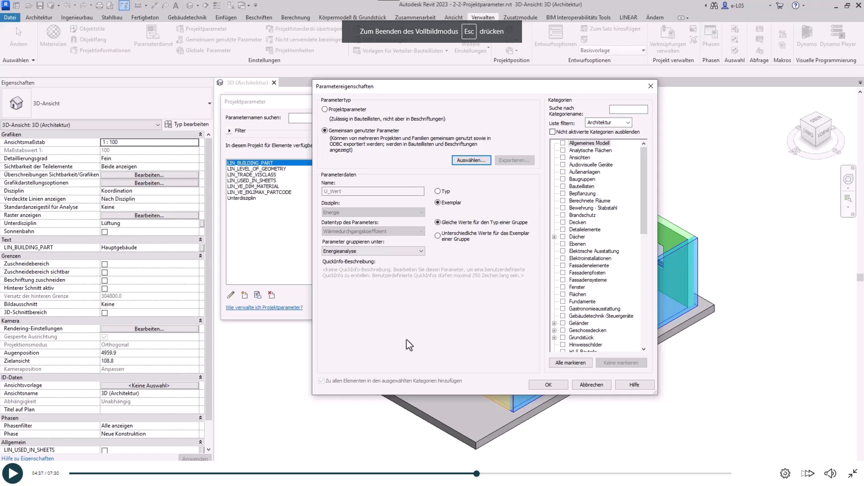 In diesem Video zeigen wir euch die Nutzung der Parametrik in Revit. Informationen zu sämtlichen Elementen im Modell werden in Parametern gespeichert, zur Definition und Anpassung der Elemente sowie für die Kommunikation der Modellinformationen in Beschriftungen und Bauteillisten verwendet. Wir befassen uns daher mit den unterschiedlichen Typen von benutzerdefinierten Parametern und demonstrieren, wie Sie Modellinformationen anhand von Parametern in Bauteillisten oder Beschriftungen ausgeben. Wir wollen also den grundsätzliche Aufbau von Revit vermitteln, sowie die Möglichkeit aufzeigen, flexibel Parameter an Objekte anzuhängen und für verschiedene Anwendungen auszuwerten.