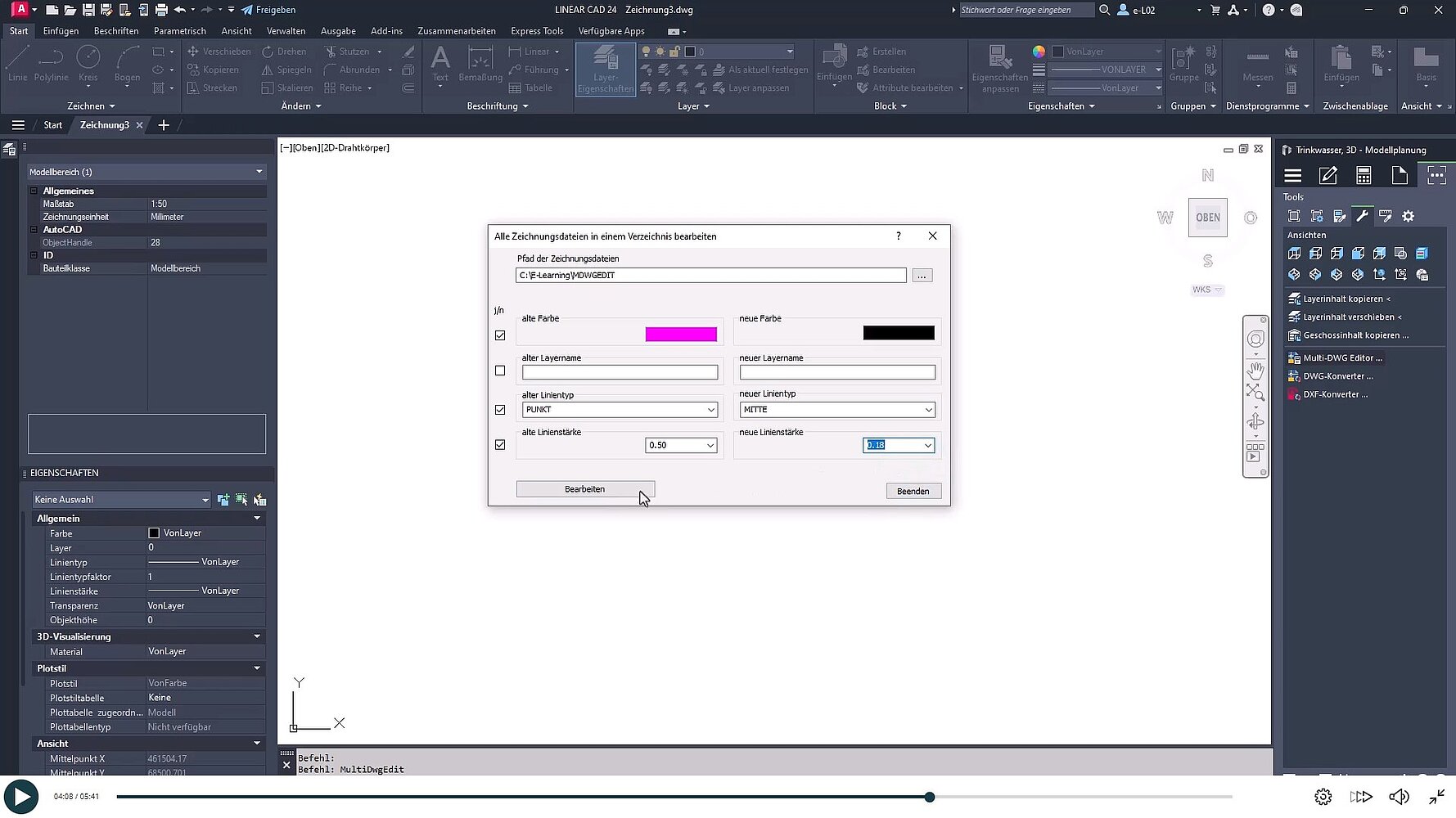 Mit dem Multi-DWG Editor können Sie alle DWG-Dateien aus einem festgelegten Verzeichnis in einem Schritt nach demselben Muster bearbeiten. Dadurch können Sie beispielsweise eine bestimmte Farbe ersetzen und im gleichen Schritt einen Layer umbenennen oder Linientypen und Linienstärken neue Werte zuweisen.