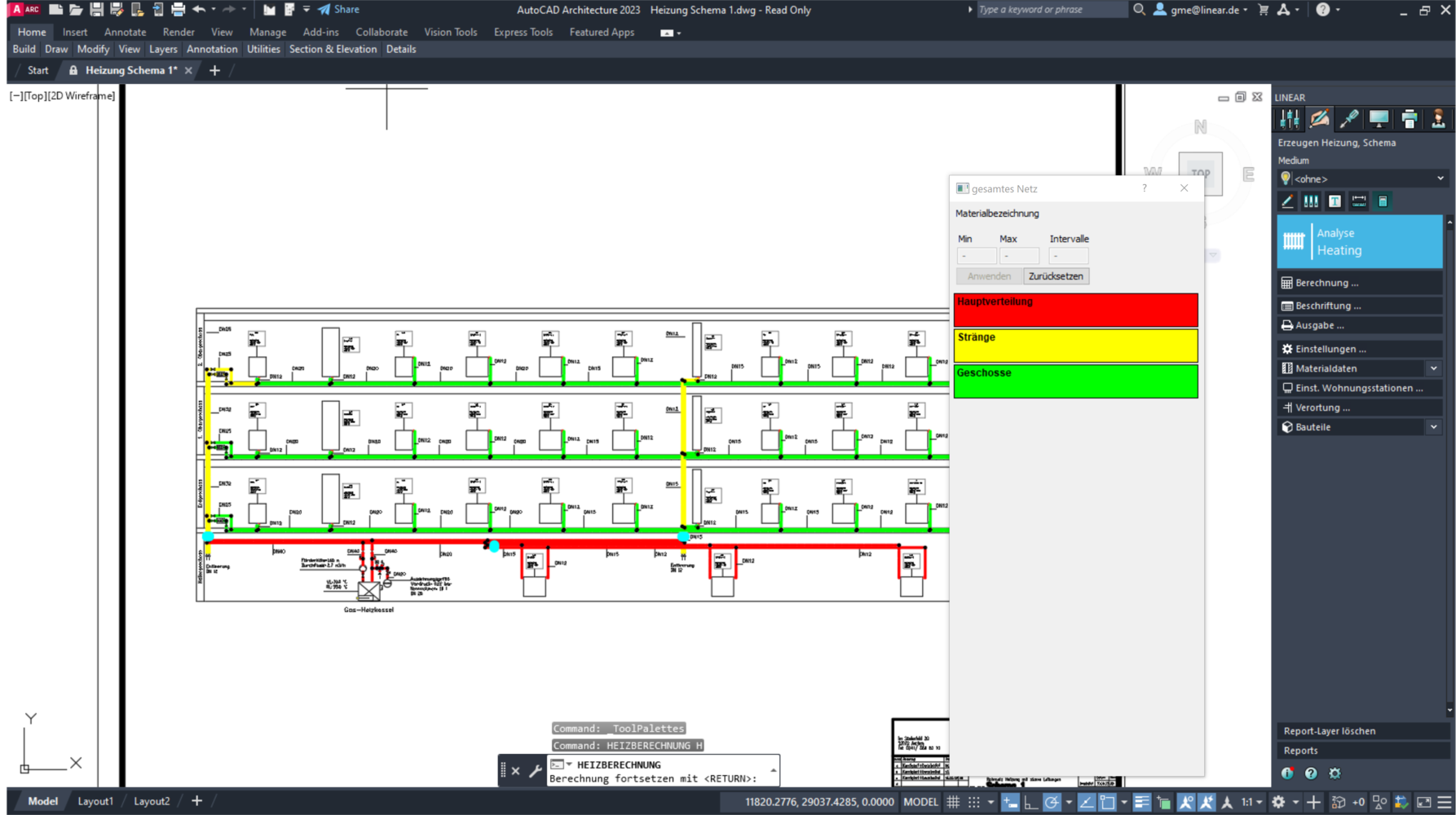 Dies entspricht einem der Anwenderwünsche, die immer wieder genannt werden. Nicht zwingend nötig, aber schon sehr hilfreich! Denn was im Schema noch einfach geht, wird in 3D-Modellen sehr aufwendig: Nämlich das Festlegen unterschiedlicher Materialien für Keller, Steig- und Geschossleitungen durch manuelle Zuweisung des Materials zu den gezeichneten Leitungen. Dies ändert sich jetzt mit der V23.2, denn das Programm kann die Zuweisung jetzt in großen Teilen automatisieren.