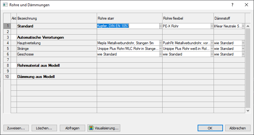 Alles was Sie also tun müssen, wenn Sie in den Bereichen unterschiedliches Material einsetzen wollen, ist es, die gewünschten Materialien für Rohre und Dämmung in die Tabelle einzutragen. Bei der Dimensionierung der Rohre und der Dämmung werden dann die entsprechenden Materialien herangezogen. Auch die Anbindematerialien für Heizungs- und Sanitäranbindungen werden – entsprechend der Leitungstypen und der Einbausituation – ermittelt und in die Materialausgabe miteinbezogen. Die manuelle Zuweisung geht natürlich wie gehabt und sie gilt, selbst wenn die Automatik etwas anderes ermitteln würde.