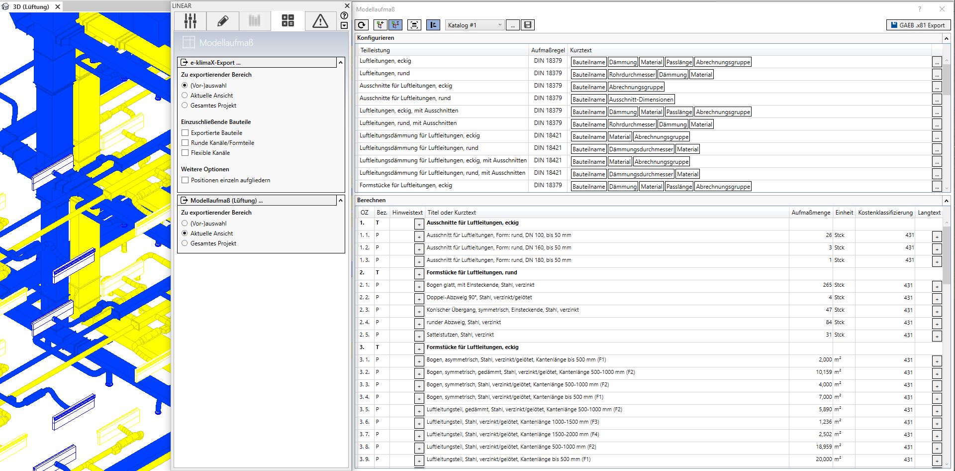 Für diese erste Version des „LINEAR Modellaufmaß“ genannten Moduls beschränken wir uns zunächst auf das Gewerk Lüftung. Die weiteren Gewerke und ferner die Schlitz- und Durchbruchsplanung werden derweilen entworfen und erreichen Sie mit den nächsten Feature Packs.