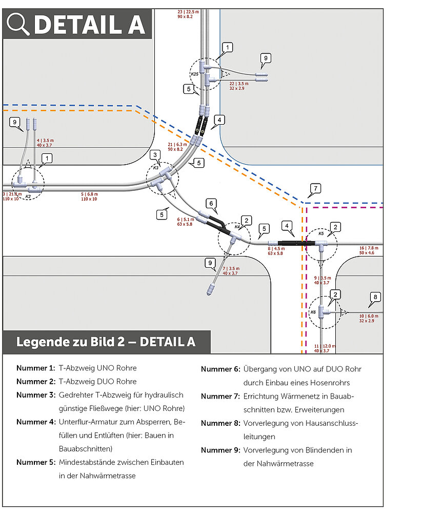 Ein Beispiel für die Netz-Planung mit der heute sehr gängigen vereinfachten Darstellung für eine Abzweig-Situation zeigt Bild 1. Der Detaillierungsgrad ist auf die grundsätzliche Trassenführung mit den Abzweigen (Knotenpunkten) und Hausanschlüssen beschränkt. Im Hinblick auf die Ausführbarkeit ist diese Planung jedoch noch unzureichend. Für den markierten Netz-Ausschnitt „Detail A“ zeigt Bild 2 wie unter Berücksichtigung des Einsatzes von PMR mit den passenden Bauteilen (u.a. der Übergang von zwei Einzelleitungen auf eine Doppelleitung mittels sogenanntem Hosenrohr) die ausführungsreife Darstellung prinzipiell aussehen kann. Eine leistungsfähige Planungssoftware sollte diesem Detaillierungsgrad künftig möglichst nahekommen.