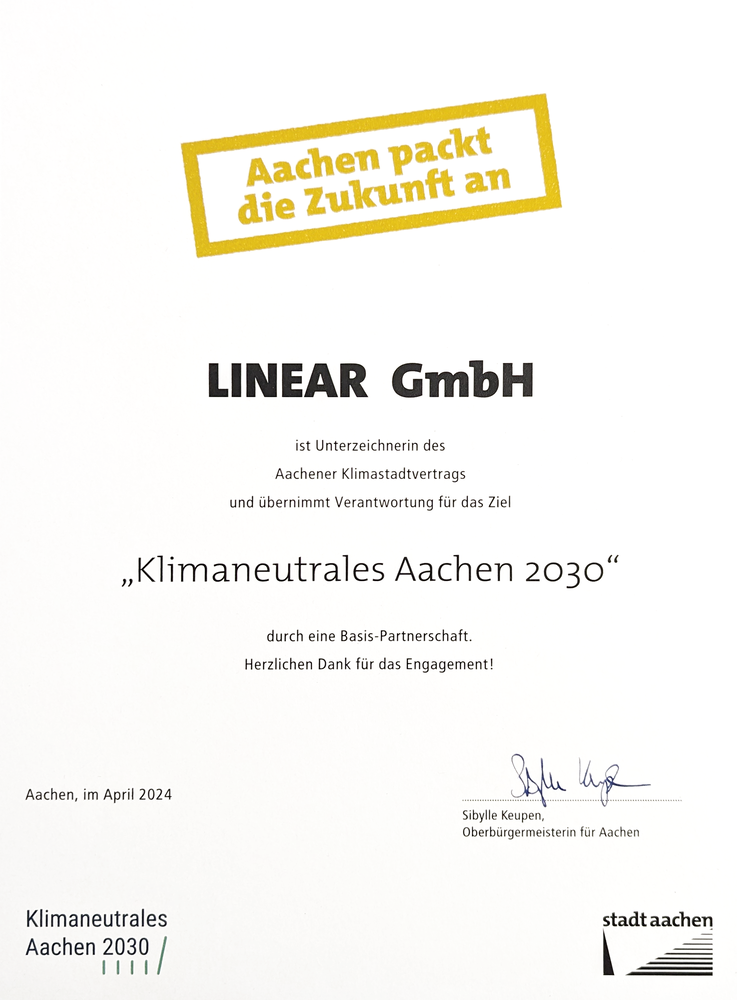 Für uns bei LINEAR ist das Engagement für soziale und nachhaltige Projekte eine Herzensangelegenheit. Aus diesem Grund unterstützen wir soziale Einrichtungen (Lesen Sie hierzu auch gerne unseren Blogbeitrag zu den „LINEAR Weihnachtsspenden 2023“) und leisten darüber hinaus unseren Beitrag zur CO2-Neutralität und Müllvermeidung. Als ansässiges Unternehmen in Aachen möchten wir aktiv Verantwortung übernehmen, um mitzuhelfen, aktuellen und zukünftigen Generationen einen lebenswerten Planeten zu erhalten. Zur Unterstützung der Stadt Aachen bei der Umsetzung eines effektiven und zielgerichteten Klimaschutzes haben wir, gemeinsam mit 131 anderen Unternehmen (Stand 27.02.2024), ein Commitment abgegeben. In unserem Fall haben wir uns als „Basispartner“ positioniert, was bedeutet, dass wir der Stadt Aachen beratend zur Seite stehen. Das beinhaltet die Bereitstellung unserer Erfahrungen in Bezug auf selbst umgesetzte CO2-Reduzierungsmaßnahmen, um anderen Institutionen zu ermöglichen, diese ebenfalls in Betracht zu ziehen oder gar umzusetzen.