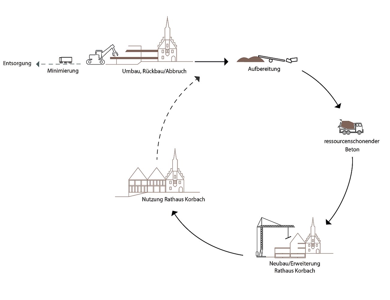 Diese Methode wurde bereits an einem Pilotprojekt angewandt. Das historische Rathaus in Korbach (Abb. 2) wird aktuell saniert und um einen neuen Anbau erweitert, der sich bereits in der Fertigstellung befindet. Das Projekt wurde von der ARGE agn heimspiel-architekten im Auftrag der Stadt Korbach geplant und realisiert (Abb. 1). Anja Rosen hat das Urban-Mining-Konzept entwickelt und das Projekt in der Vorplanung mit dem UMI analysiert und bewertet. Der alte Anbau, ein Betonbau aus den 1970er-Jahren, wurde als „Rohstoffmine” verwendet, indem die abgebrochenen mineralischen Baumaterialien für den Neubau regional aufbereitet und wiedergewonnen wurden. Für einen möglichst sortenreinen Rückbau musste der Prozess präzise geplant und kalkuliert werden. So erfolgte der Abbruch hoch selektiv unter größtmöglicher Berücksichtigung der sortenreinen Materialtrennung. Mit diesem Verfahren konnten ca. zwei Drittel der Abbruch-Baustoffe in unterschiedlichen Qualitäten zurück in den Materialkreislauf gebracht werden – von der Auffüllung der Altfundamente über den Einsatz im konstruktiven Beton bis hin zur Fassade (Abb. 3).