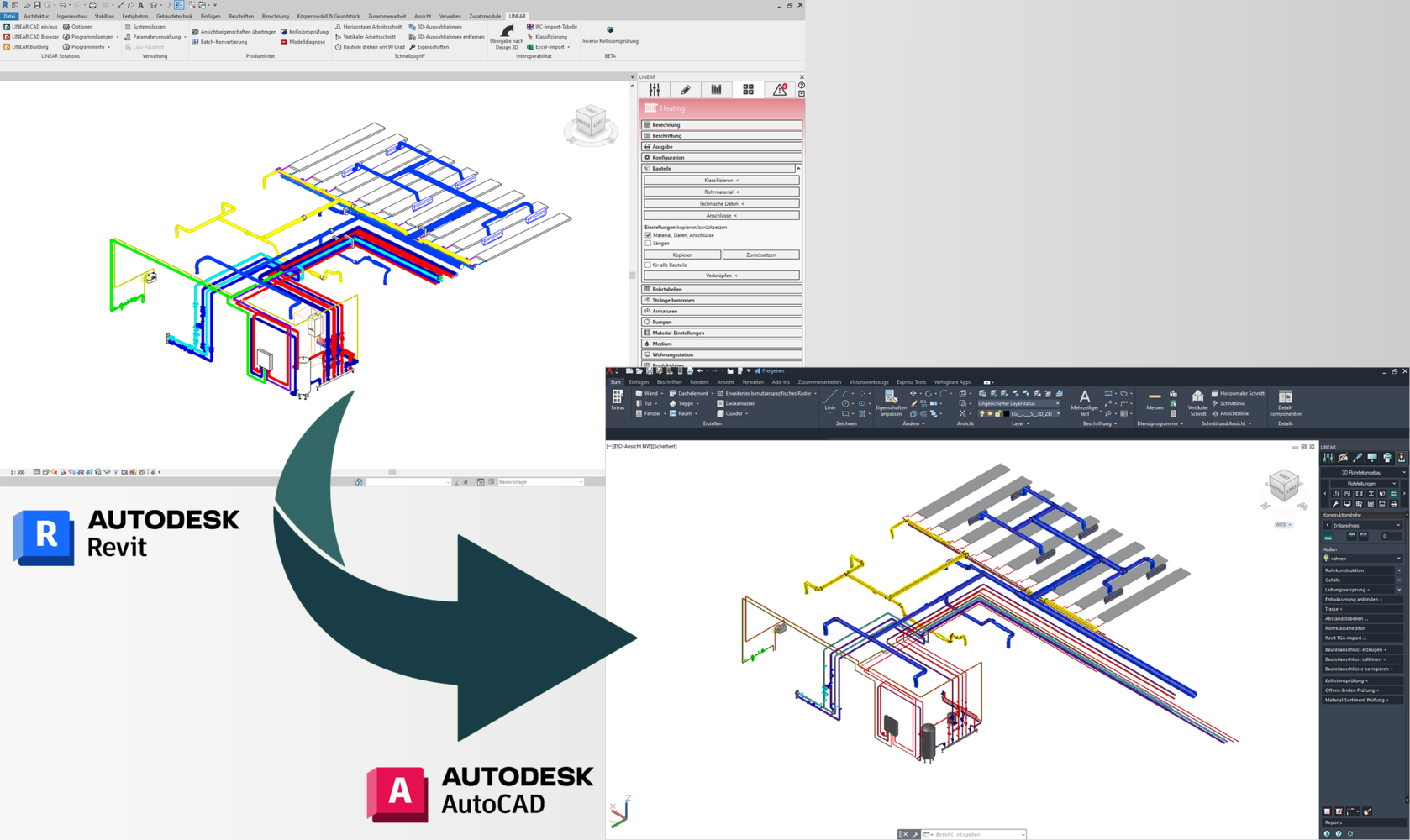 Bei der Ausführungs- und Montageplanung können die LINEAR Design 3D Programme für AutoCAD ihre Stärken in Sachen Detaillierungsgrad voll ausspielen. In diesen späten Leistungsphasen wird die Flexibilität eines Revit-Designs nicht mehr benötigt, da die parametrischen Modelle durch fixe Herstellerbauteile ersetzt wurden und die Informationen der Verbindungstechnik in den Fokus rücken (Detaillierung bis zur letzten Schraube). Im Falle eines solchen Plattformwechsels musste bisher das Revit-Modell aufwendig in AutoCAD nachkonstruiert werden.