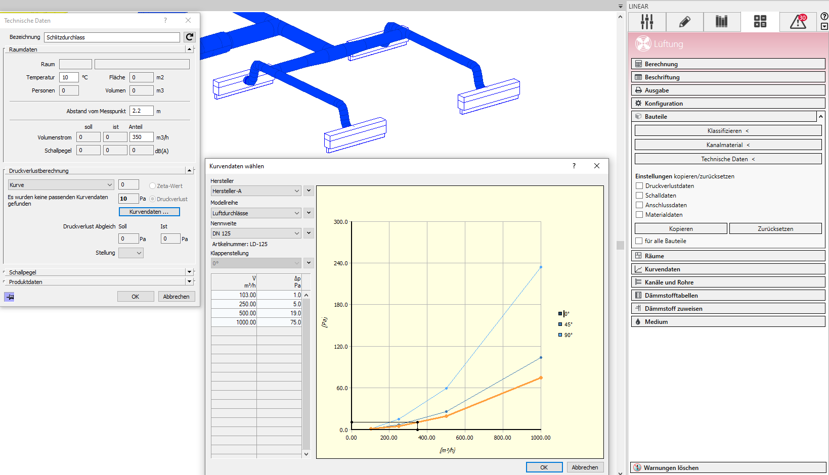 In der Kanalnetzberechnung können Sie jetzt Druckverlustkurven für selbstdefinierte Hersteller, Modellreihen und Nennweiten erfassen und danach den entsprechenden Bauteilen zuweisen. In der Berechnung wird der Druckverlust des Bauteils entsprechend dem herrschenden Volumenstrom ermittelt. Bei Luftdurchlässen können Sie ebenfalls Druckverlustkurven der Klappenstellungen hinterlegen, sodass diese auch für den strömungsmechanischen Abgleich des Systems genutzt werden können.