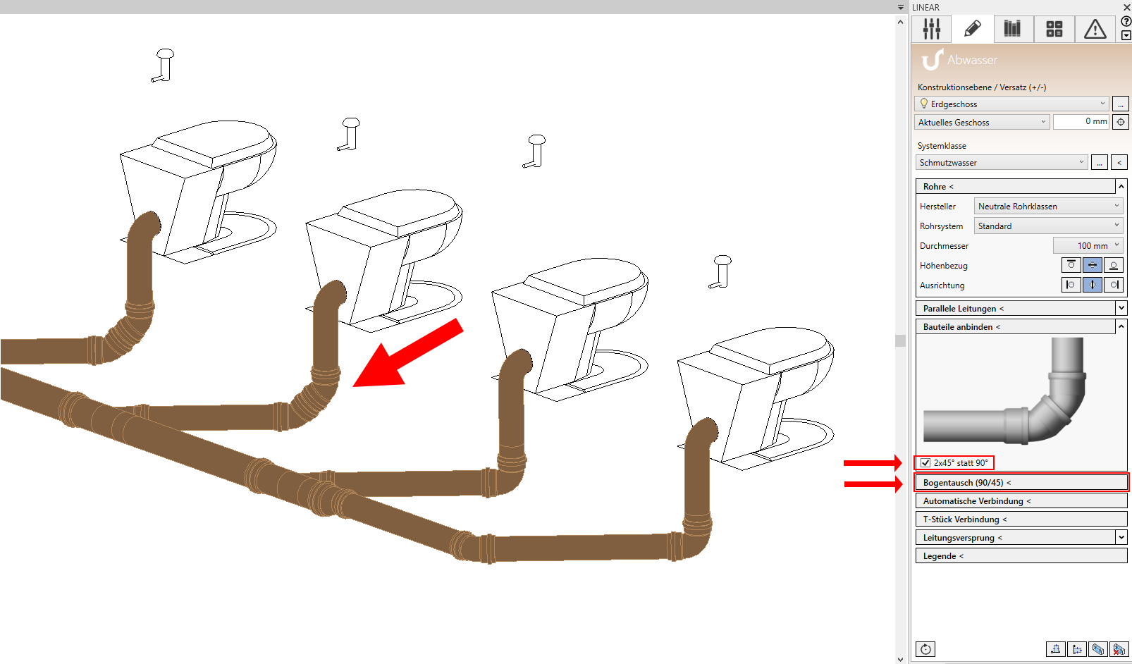 Für eine einfachere Konstruktion von Abwasserleitungssystemen steht Ihnen jetzt bei der Funktion Bauteile anbinden die Option zur Verfügung, 90° Umlenkungen mit einem Bogen oder mit zwei 45° Bögen zu konstruieren. Auch bereits konstruierte Umlenkungen können einfach getauscht werden. Hierfür nutzen Sie die neue Funktion Bogentausch (90/45), mit der Sie ganz einfach einen 90° Bogen durch zwei 45° Bögen tauschen können, und umgekehrt.