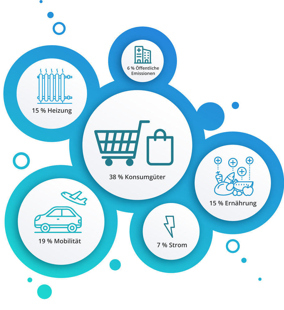 In Abbildung 2 wird der CO₂-Ausstoß einer durchschnittlichen Person (laut destatis 9 Tonnen pro Kopf jährlich, Stand 2019) ins Verhältnis mit dem Konsumverhalten gesetzt. Allen voran sind Konsumgüter mit 38 % am schwerwiegendsten. Alltagsgegenstände wie Uhren, Kleidung und elektronische Geräte besitzen alle einen CO₂-Fußabdruck, der vor allem bei der Produktion entsteht. Bei der Verwendung selbst kleiner, scheinbar nebensächlicher Artikel wird ebenfalls CO₂ freigesetzt. Beispielsweise elektrische Zahnbürsten, die in 40 % der deutschen Haushalte zu finden sind. Ohne den Ausstoß bei der Produktion mit einzuberechnen, gehen täglich 72 Gramm Kohlenstoffdioxid auf das Konto der kleinen Alltagshelfer, allein durch den Energieaufwand der Nutzung. Diese Art des Konsumierens entsteht mehrmals täglich – vornehmlich unterbewusst – und kumuliert sich im Verlauf des Tages. Konsum beschreibt laut Bundeszentrale für politische Bildung „die Inanspruchnahme von Gütern und Dienstleistungen zur unmittelbaren Bedürfnisbefriedigung durch private oder öffentliche Haushalte“.