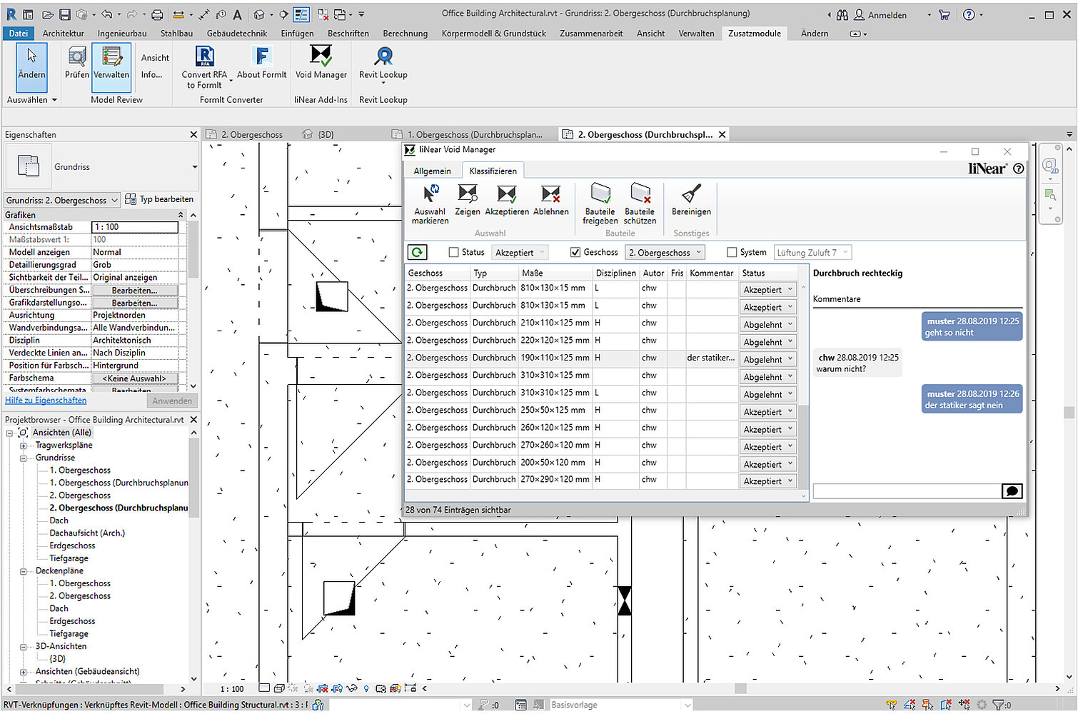 - die im LINEAR Desktop generierte BCF-Datei für die Prüfung, Freigabe und weitere Bearbeitung aller Schlitze und Durchbrüche.