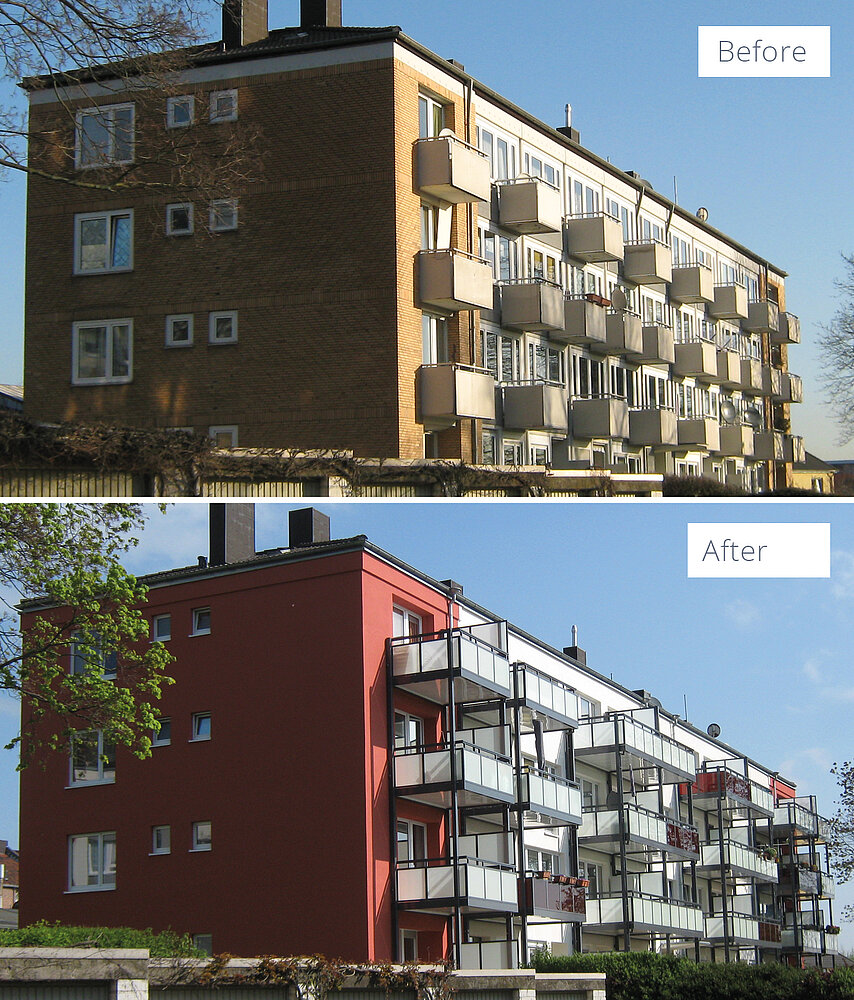 In order to reduce the energy requirements of the 123 apartments in the Wiesental project, it was necessary to upgrade the energy efficiency of the building envelope. The façades of the buildings from the 1960s with integrated balcony slabs and a wide variety of surfaces (tiles, clinker, plaster, curtain walling) showed age-related damage. The existing balconies were sawn off and replaced by balcony towers to minimize the thermal bridges. The floor space of the balconies was adapted to today's needs, i.e. balconies at the living rooms were enlarged, very small exits at the kitchens were removed. Altogether the living space could be enlarged.