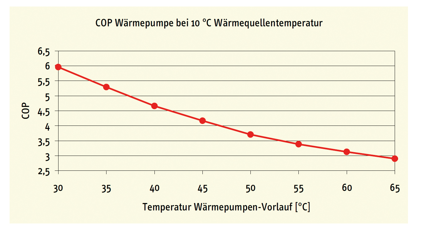 For central hot water generation - whether with hot water tank or fresh water station - a hot water temperature of 60 °C must be ensured for hygienic reasons. This requires permanent temperatures of about 65 °C from the heat generator. This temperature can be reached with heat pumps. However, this is not efficient in terms of achieving a high annual performance factor: Despite a favourable heat source with temperatures above 12 °C throughout the year, the annual coefficient of performance can hardly exceed 3.0 if 65 °C has to be delivered permanently (Fig. 2).