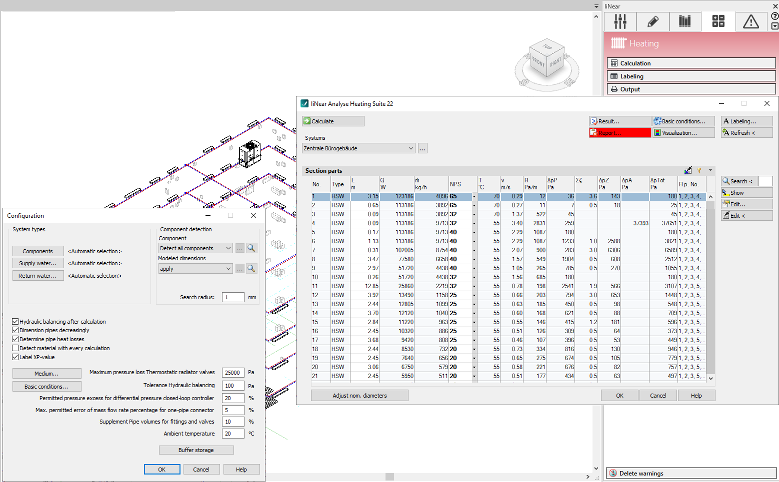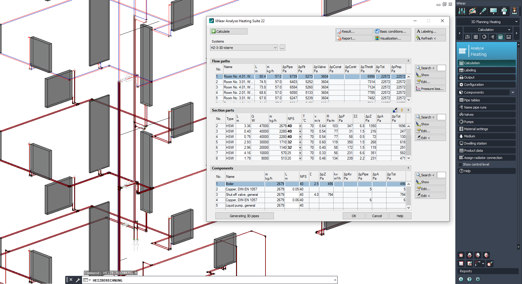 Let me explain this in more detail: The main objective of our pipe network calculations across all trades is always the ideal dimensioning, taking into account all relevant boundary conditions. There are also other important factors as the correct selection of components, the determination of the perfect setting values for all regulating network components and last but not least a complete parts list - from the generator(s) to the consumers with all pipes and fittings, including transitions. All this works in a schematic plan as well as in a (pre-)dimensioned 3D model, whether in Revit or AutoCAD. The pipe network calculations even offer an adjustment of the modeled pipe dimensions to the calculated pipe dimensions.