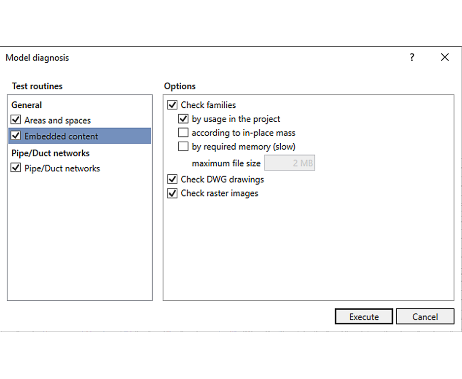Checking the model for problems with unused families, families that are too large, embedded DWGs and unused raster images.