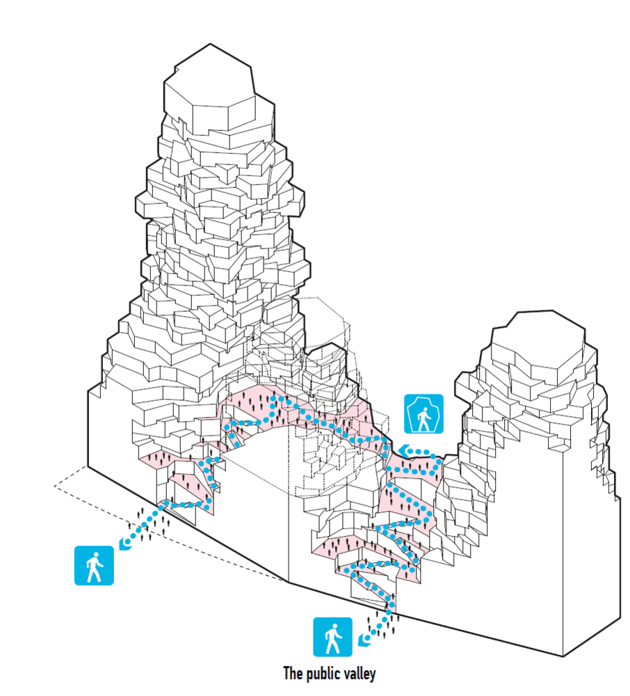 By placing the residential units on top of the multifunctional base and pushing them to the edge of the building envelope, a building volume is created that acts as one unit. The interior facade is defined by a series of robust stone terraces with large planters that cover the building with vegetation and give the Valley a sense of human scale. This contrasting treatment of the facades expresses the duality of the emerging structure, which is reminiscent of a hollowed-out block.