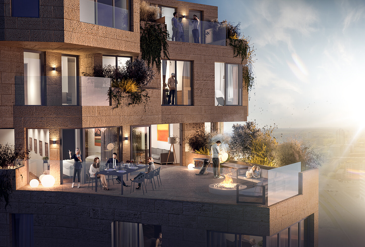 The office space is characterized by floor-to-ceiling windows, large bright areas and comprehensive service facilities. The residential floors also have large windows and sliding doors for outdoor areas integrated into the stone facades. Exterior ceilings and terraces are also clad in natural stone, as are the permanently installed, automatically moistened planters of varying heights that define Valley's green appearance. The all-glass railings protect residents from wind and noise without compromising the panoramic view of the city.