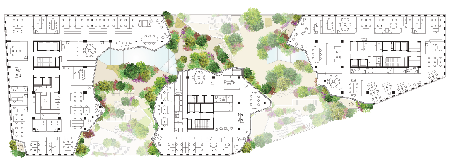 The Valley's 3 peaks of varying heights reach to a maximum height of 100 meters, where the top two floors are home to the Sky Bar, which is open to the public and offers an impressive panoramic view of Amsterdam. The building consists of 200 apartments, 7 floors of offices, a three-story underground parking garage with 375 parking spaces, and different retail and cultural facilities (see Figure 1). From the adjacent street, a walkway leads up along retail stores, terraces and rooftop gardens to the “valley area” that extends across the 4th and 5th floor and surrounds the central tower (see Fig. 2). Internationally renowned landscape architect Piet Oudolf designed all of the Valley's vegetation, focusing on a year-round green appearance.