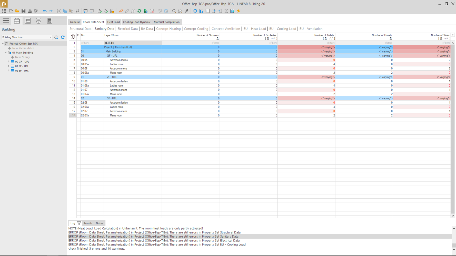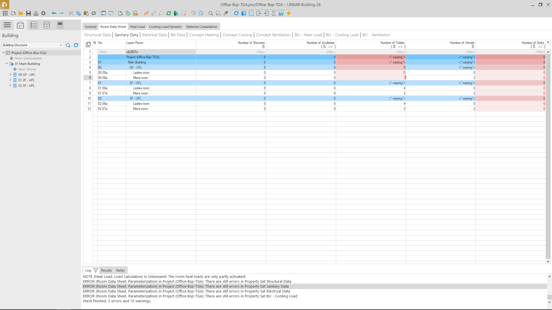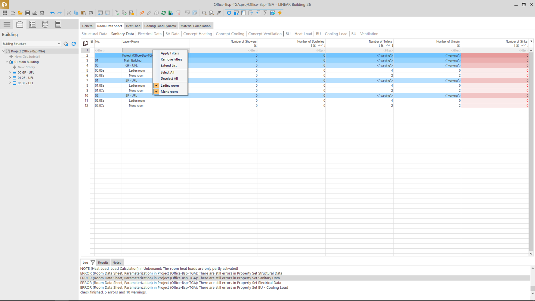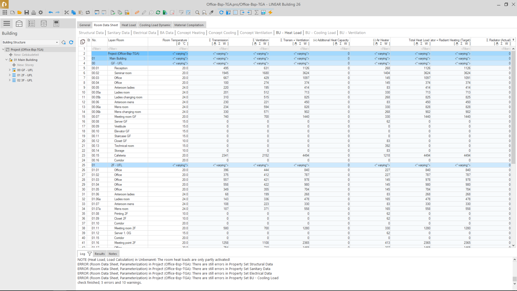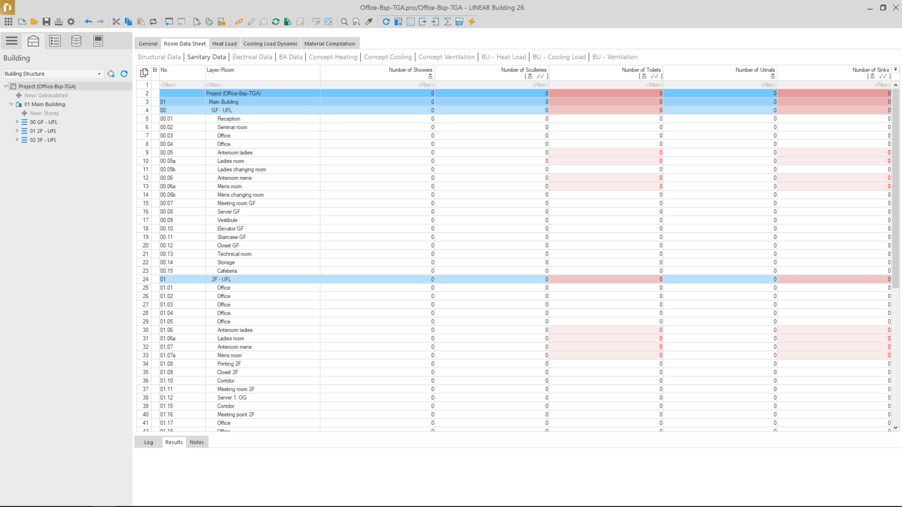 The information collected in the Room Data Sheet module provides a reliable foundation for calculations, such as heating and cooling loads, and is synchronized across all relevant LINEAR planning modules. The Room Data Sheet serves as a central data collection point that can be continuously maintained and used by all project participants.