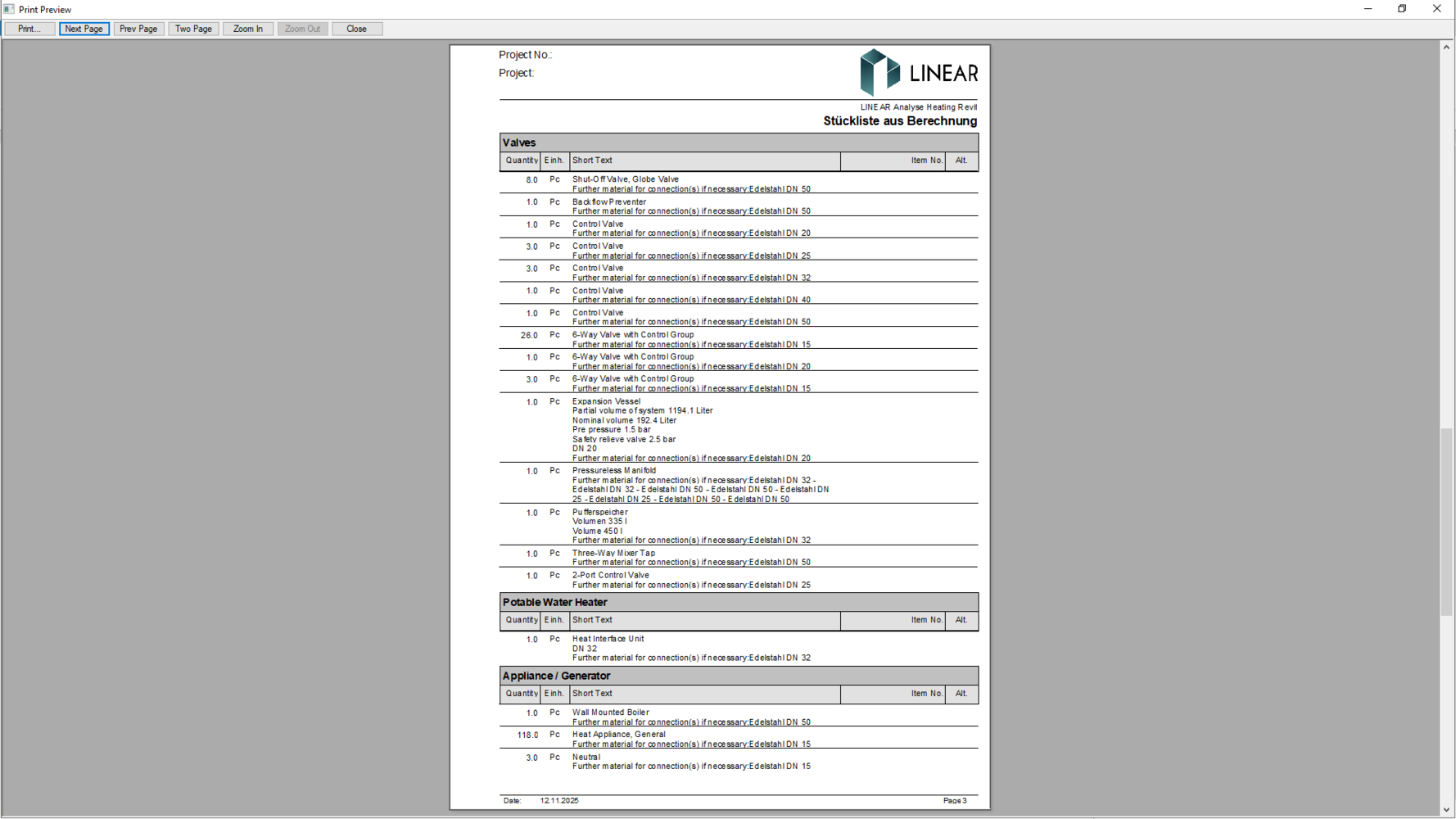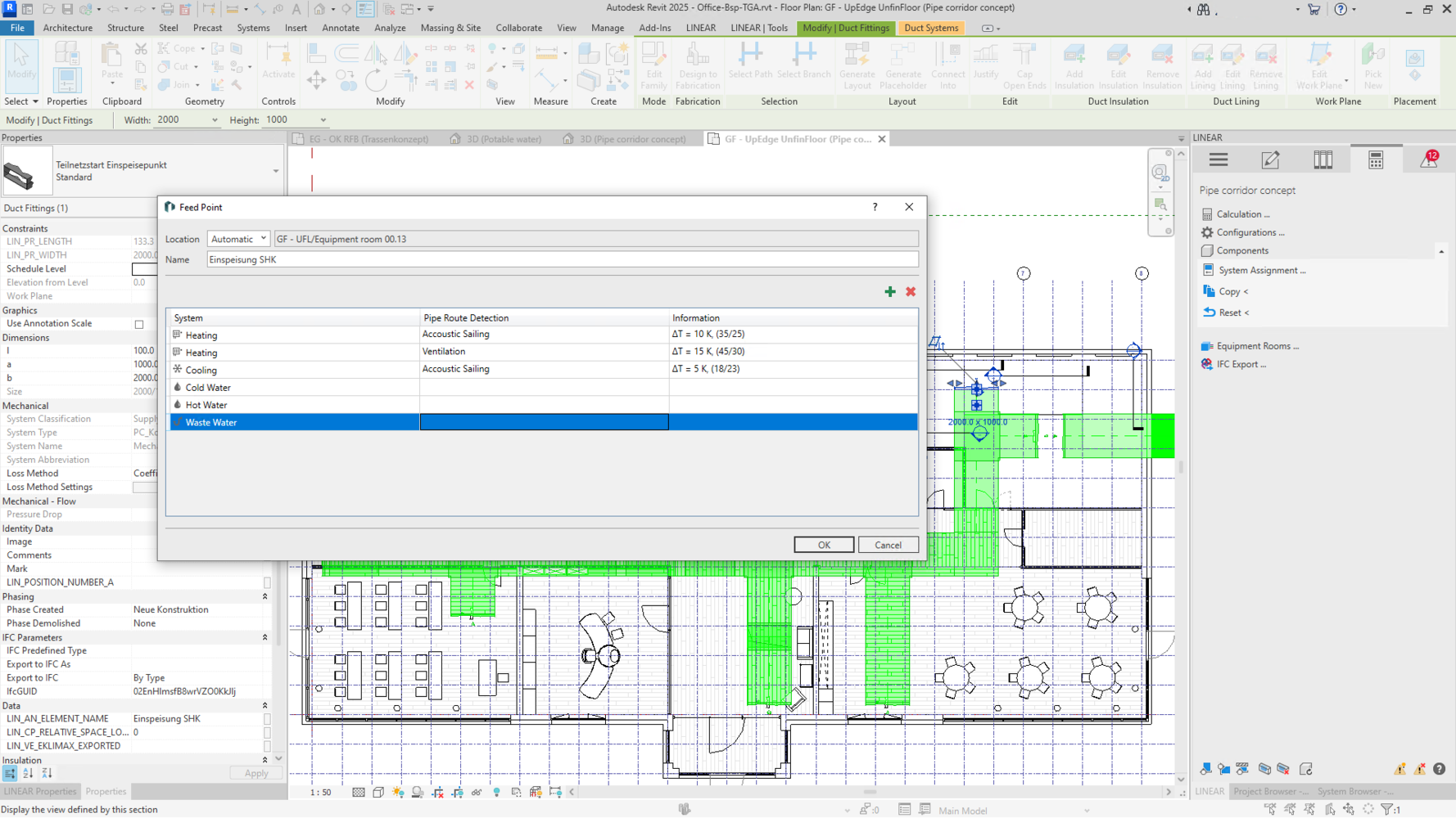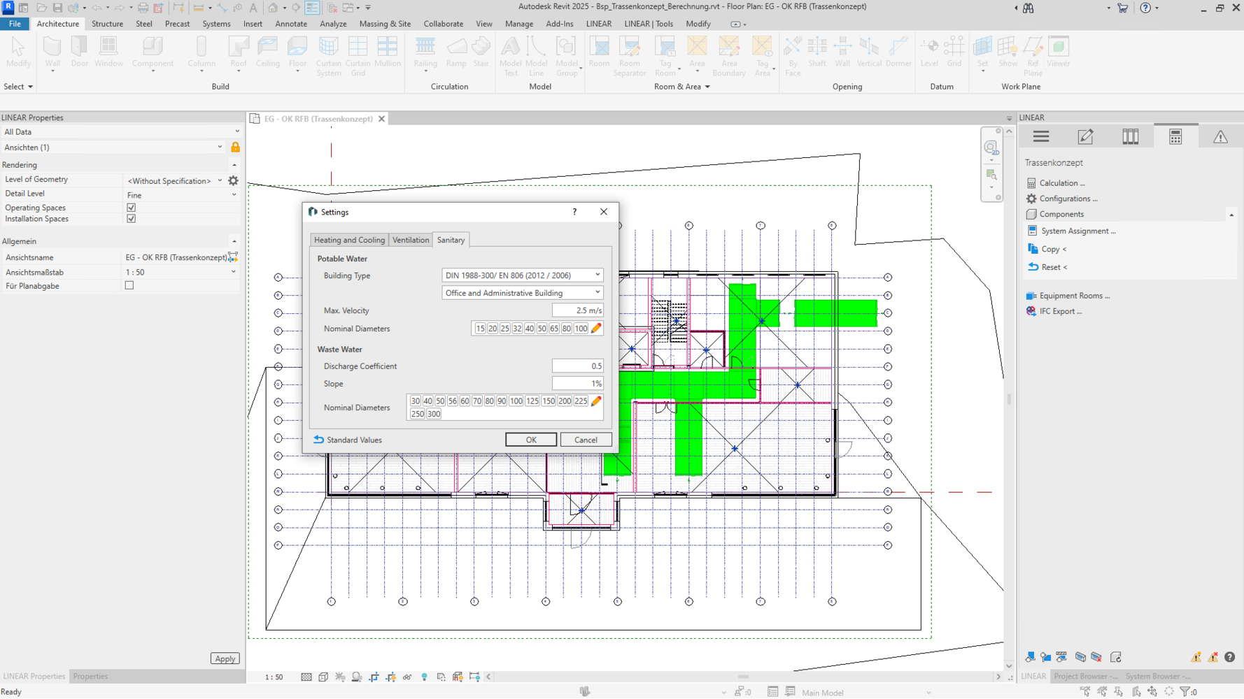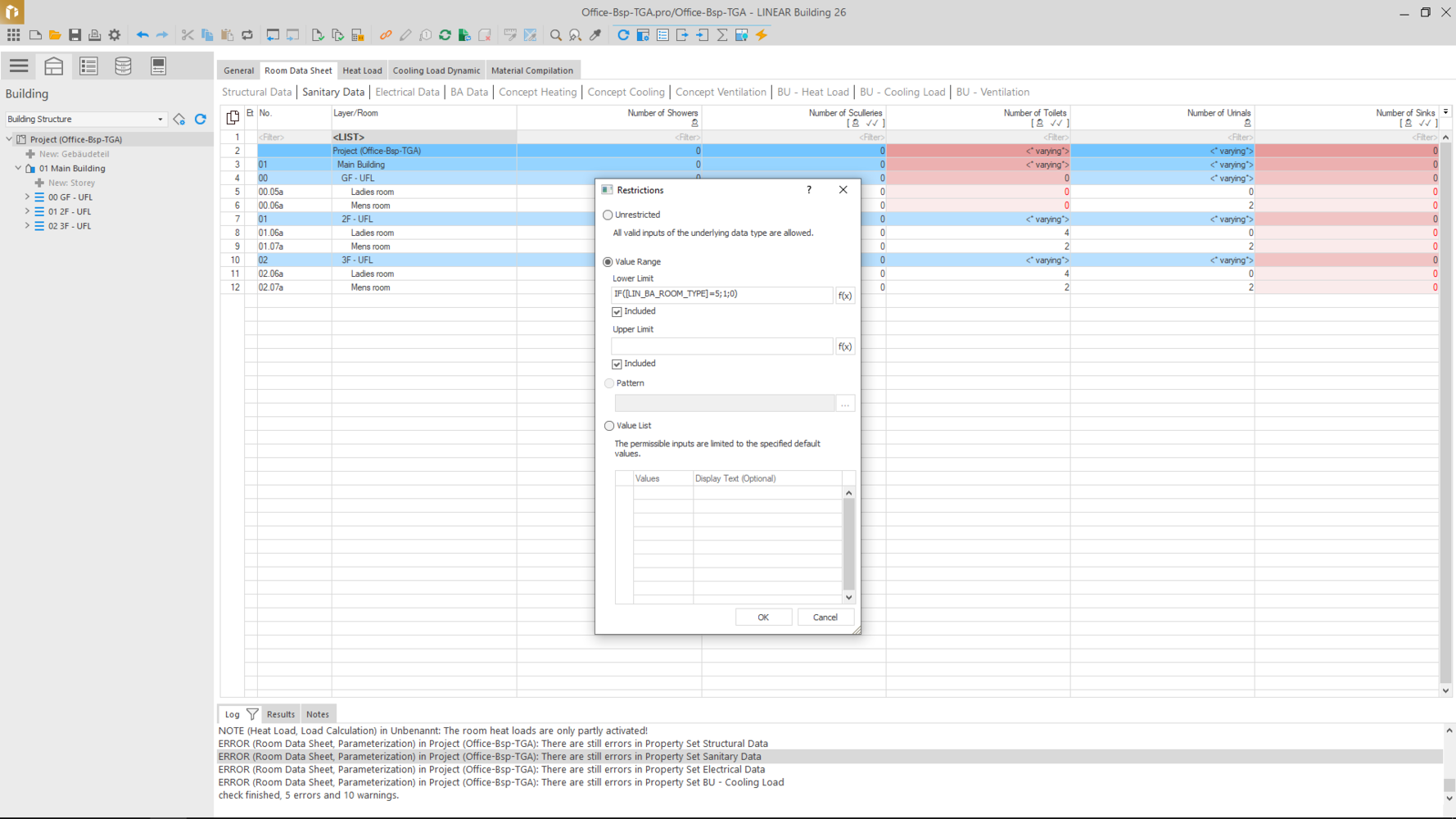 The information collected in the Room Data Sheet module provides a reliable foundation for calculations, such as heating and cooling loads, and is synchronized across all relevant LINEAR planning modules. The Room Data Sheet serves as a central data collection point that can be continuously maintained and used by all project participants.