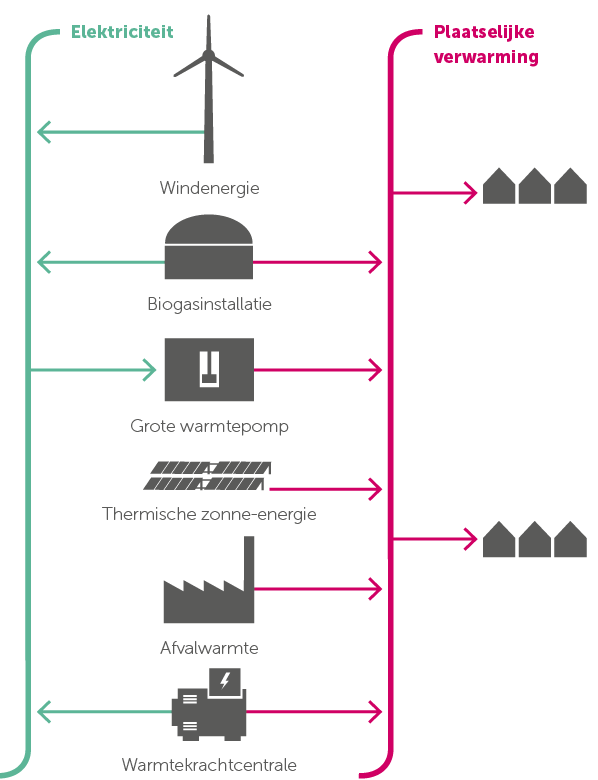 Warmtepompen zullen in de toekomst het dominante verwarmingssysteem zijn voor individuele gebouwen. In dichtbebouwde gebieden bieden gecombineerde oplossingen met verwarmingsnetwerken vaak voordelen. Hernieuwbare energiebronnen zoals rivierwarmte of onvermijdelijke afvalwarmte van handel en industrie en thermische zonne-energie kunnen economisch worden benut. In de toekomst zullen grote warmtepompen hier de belangrijkste warmteopwekkers zijn (figuur 1). Daarnaast biedt het gebruik van (vaste) biomassa regionaal potentieel.