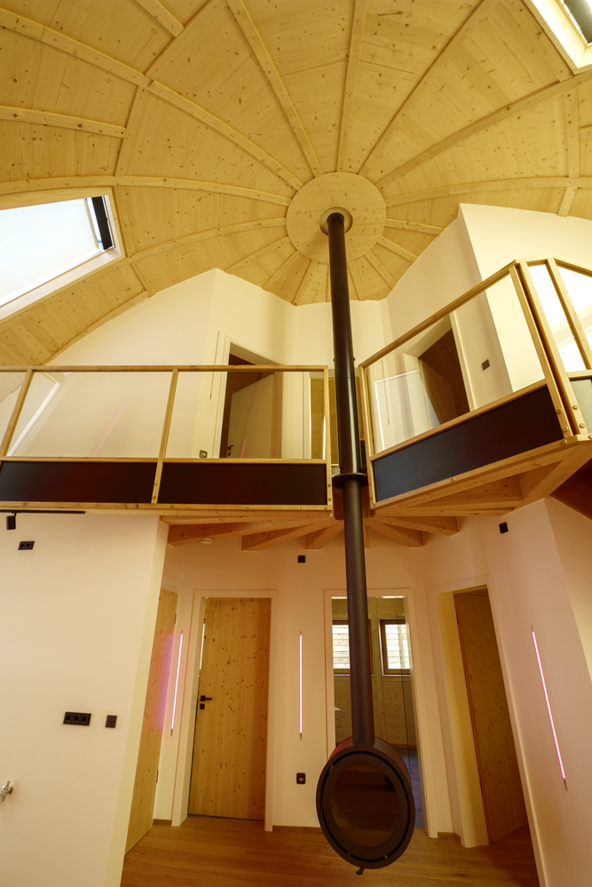 De ronde architectuur van de woning is een blikvanger. Het heeft een gevel van houten leien, is licht en vriendelijk ingericht, biedt een open woon- en eetruimte met panoramische beglazing en een vrijhangende open haard. Het huis heeft een diameter van 11 m, 116 m² woonruimte en 27 m² bruikbare ruimte. Dankzij de ecologische bouwmethode met houtvezelisolatie en hout-aluminium ramen is de warmtelast van het gebouw slechts ongeveer 3 kW en het uiteindelijke energieverbruik 22,15 kWh/m² per jaar.
