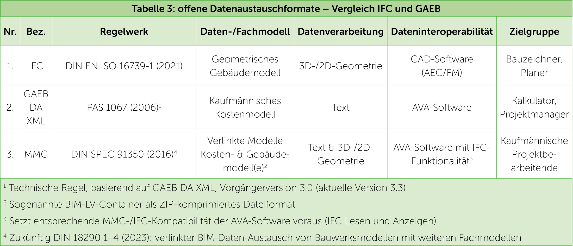 Gestandaardiseerde bestands- en gegevensuitwisselingsformaten zijn over het algemeen doel- en toepassingsspecifiek met als hoofddoel om compatibiliteit te bereiken en softwarieneutrale gegevensuitwisseling mogelijk te maken. De gegevensformaten GAEB XML en IFC voldoen beide aan de criteria van een open en dus openBIM-conforme gegevensuitwisseling. De gegevensstructuur en informatie-inhoud van een IFC-bestand verschillen echter fundamenteel van een GAEB-bestand, wat te wijten is aan de verschillende toepassingsdoelstellingen en -processen van een geometrisch model (CAD) enerzijds en een commercieel model (AVA) anderzijds.