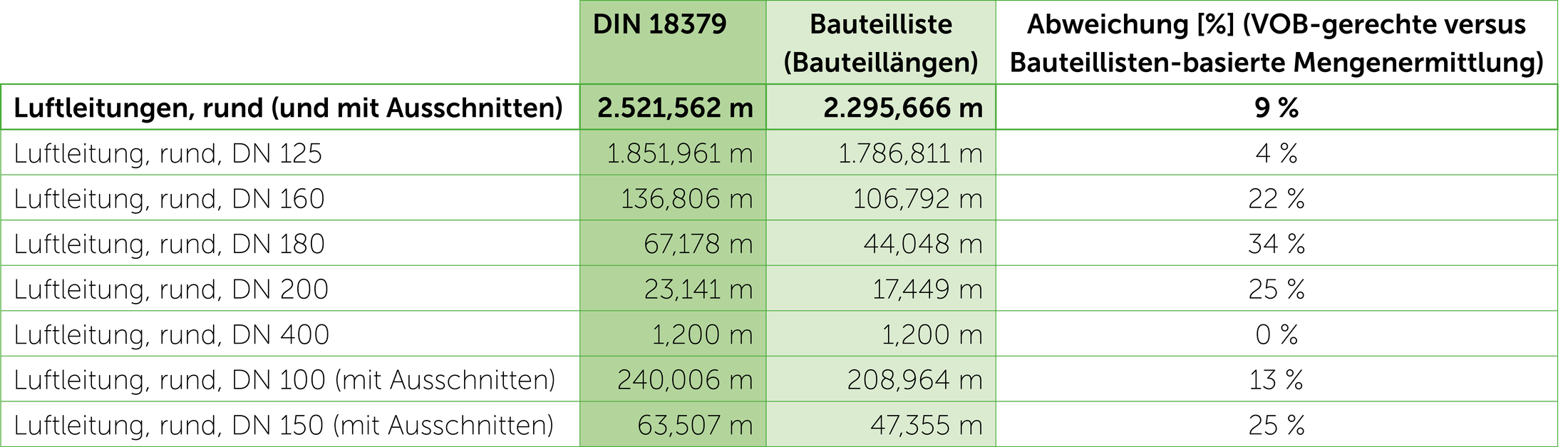 In een vergelijking van metingen tussen een puur op componentenlijsten gebaseerde hoeveelheidsmeting in Revit en een VOB-conforme hoeveelheidsmeting met LINEAR, kunnen bij toepassing van deze regels al hoeveelheidsafwijkingen van gemiddeld 9% worden verwacht voor een relatief eenvoudige lengtemeting van ronde luchtkanalen (tabel 2).