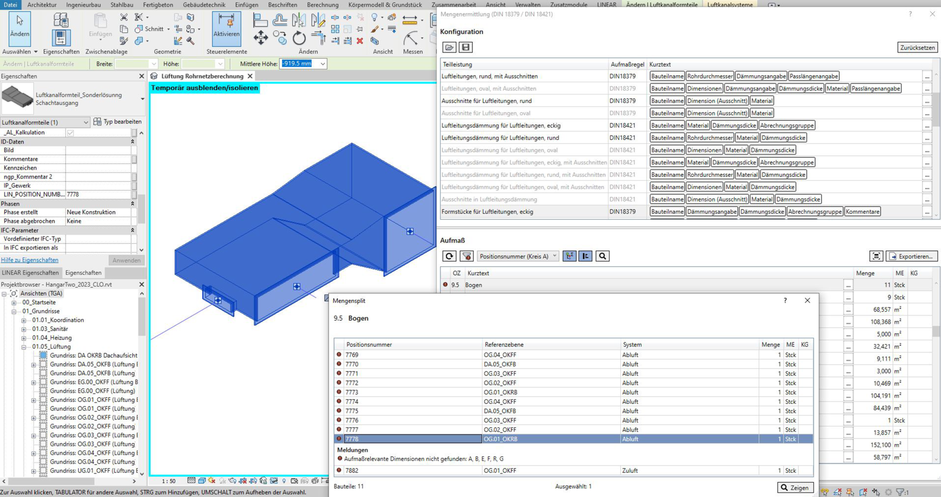 Dit betekent dat het ventilatienetwerk en de componenten (luchthoeveelheidsregelaar, geluiddemper) idealiter volledig geclassificeerd en gedimensioneerd zijn voor een modelmeting, d.w.z. alle benodigde informatie over druk, geluid en materiaalgegevens, inclusief de kostengroepen, is opgeslagen in het model. Geometrieën van kanalen worden gecontroleerd tijdens de berekening van het kanaalnetwerk en indien nodig opnieuw gedimensioneerd. Deze modelleerprincipes zijn van toepassing ongeacht of er fabrikant-specifieke componenten uit de LINEAR CAD-browser worden gebruikt of dat er alleen neutrale families worden gebruikt.