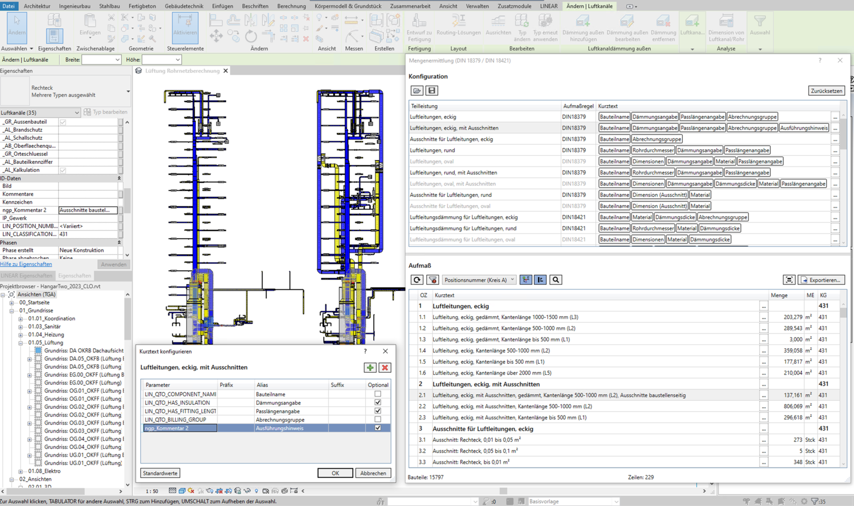 Voor een VOB-conforme hoeveelheidsbepaling worden voornamelijk specifieke modelleringseisen gesteld aan ventilatiefamilies of ventilatiegerelateerde pijp- en kanaalklassen, die een voor de meting relevante parametrisering moeten hebben. Componenten worden tijdens het berekeningsproces aan de LINEAR-zijde gecontroleerd op DIN-conformiteit.