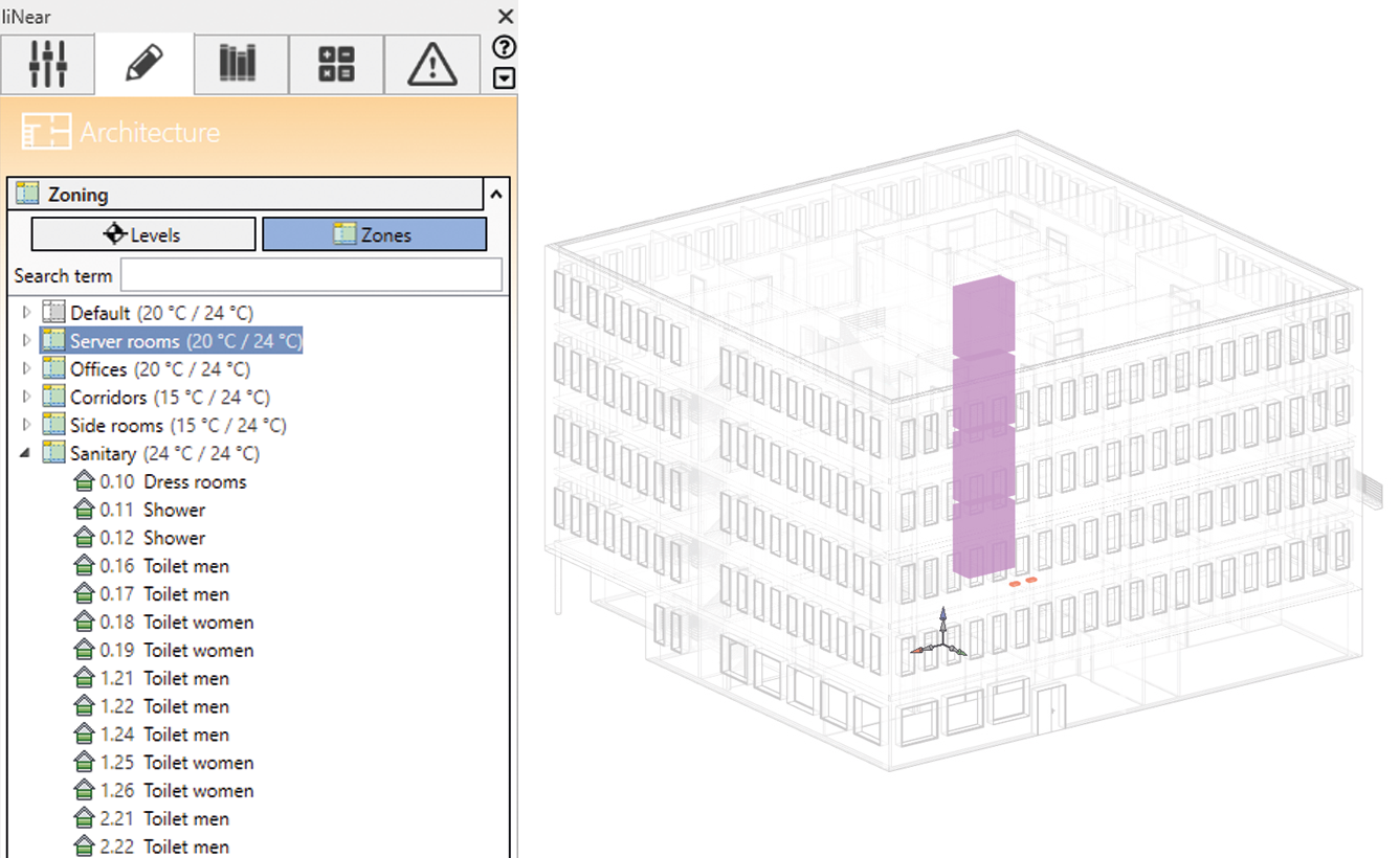 Het groeperen van ruimtes in zones is onder andere handig voor het eenvoudig bepalen van doeltemperaturen voor verwarming of koeling. In Revit bestaat de basisfunctionaliteit voor zonering al. De zoneringsdialoog in de LINEAR Desktop voegt daar een ideaal beheer en een perfect overzicht aan toe.