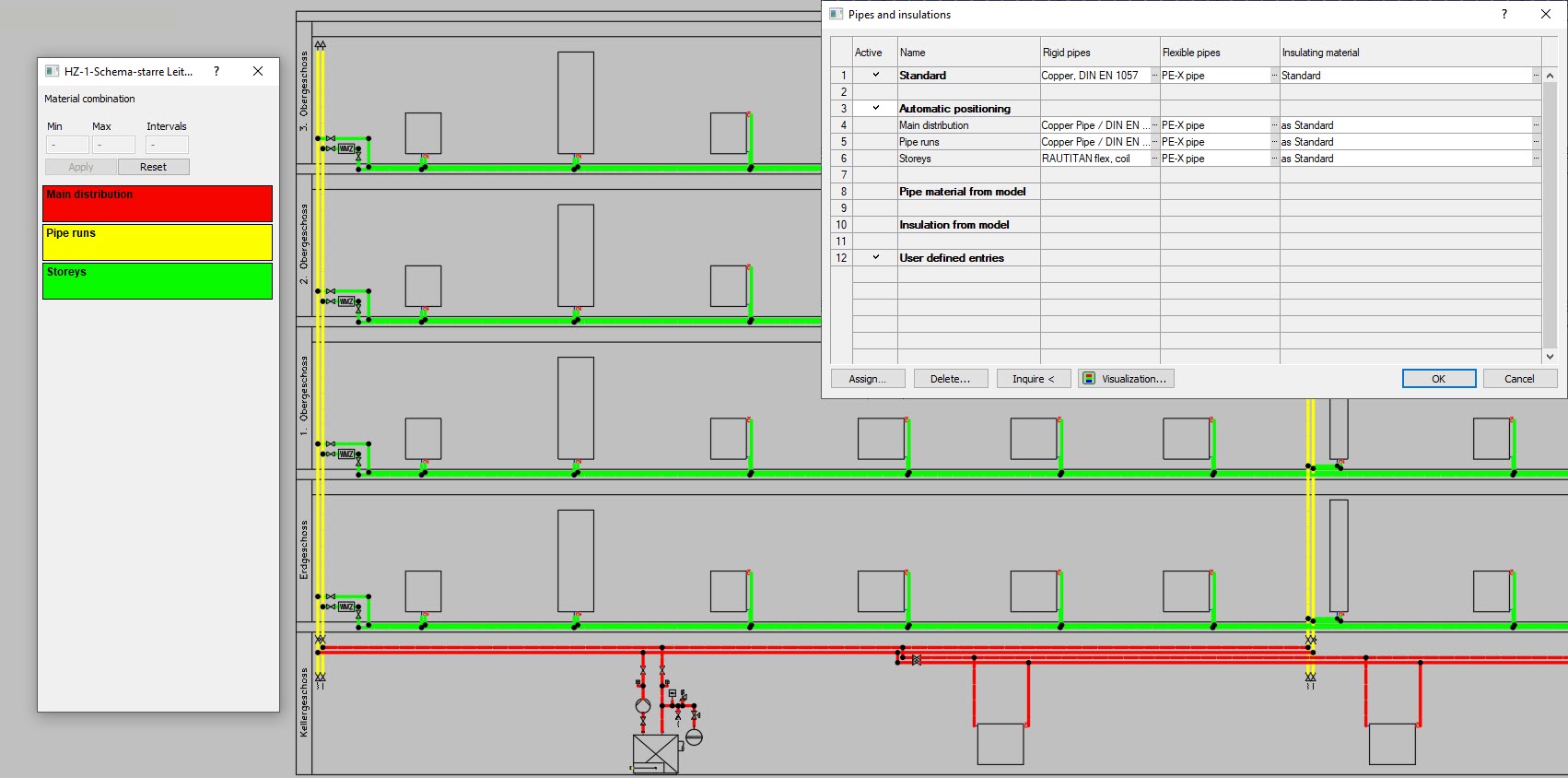 Voor een eenvoudigere toewijzing van verschillende materialen voor verschillende situaties in het netwerk, bijv. kelderleidingen, stijgleidingen, vloerverdelingen, is er nu de optie "Automatische locatie", ook in het dialoogvenster Leidingen en isolatie.