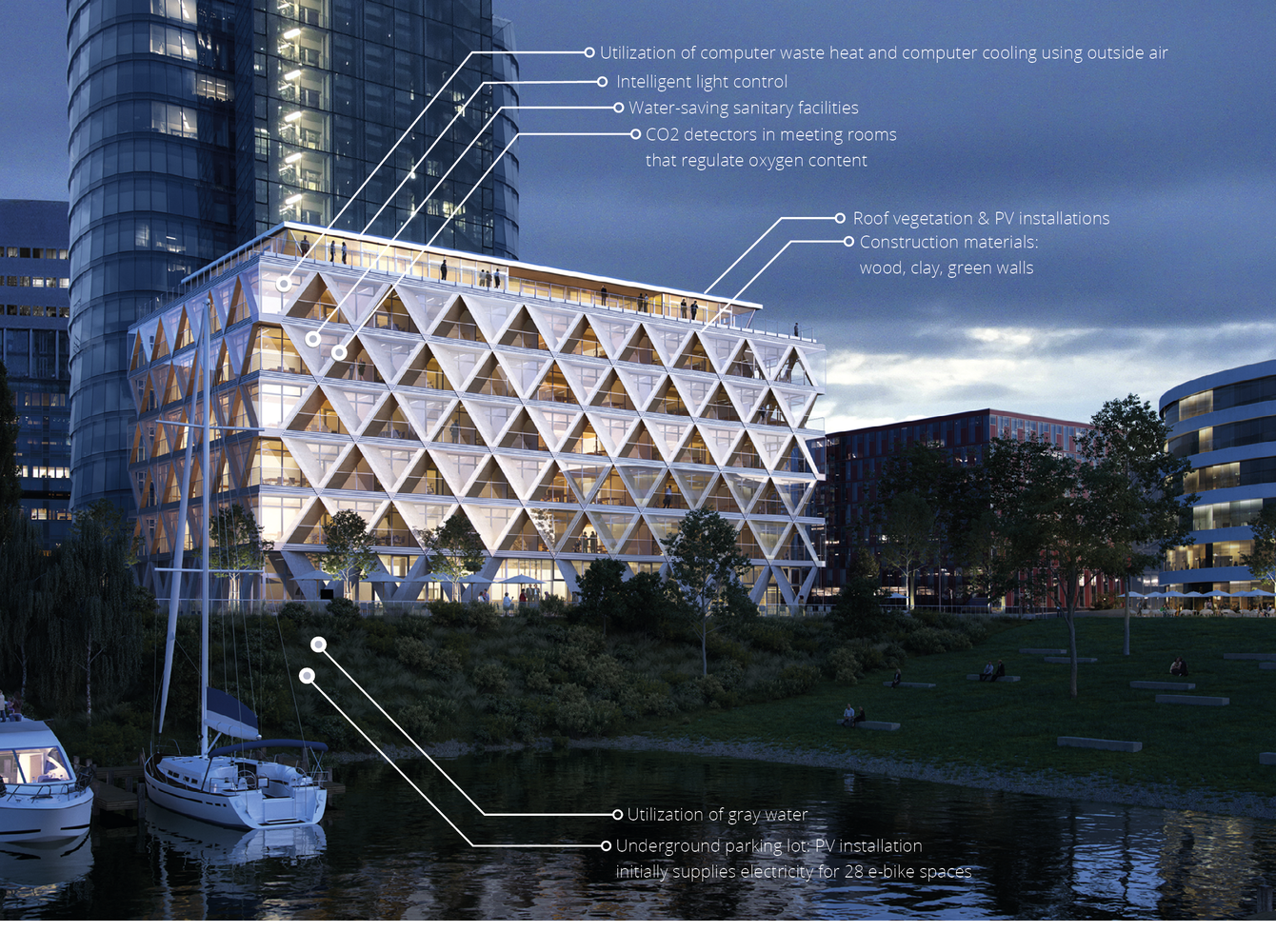 How successful this can be is demonstrated by the “The Cradle” flagship project, designed by HPP Architects, in the Medienhafen in Düsseldorf (see Figure 3), the construction of which has begun already (in spring of 2020) on behalf of the innovation-driven project developer Interboden. In line with its name, the wood-hybrid office building is aimed at having a positive effect on the environment and human beings. The building is made mainly out of wood – with the exception of the basement, ground floor and core structure – which is especially visible in the rhombus-shaped facade. Because of the depth of the construction, through its varying dimensions the wood pattern produces shadows – dependent on geographic direction – in the form of a grid, which is especially beneficial in summertime. Moreover, the raw material has the ability to bind CO2 in the air, so it contributes to an improvement of air quality indoors.
